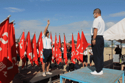 まずクラスごとの入場行進で体育大会がスタート。各クラスともクラス旗を高く掲げた体育委員を先頭に、大きなかけ声で足並みをそろえた若さあふれる行進を披露し、保護者の皆さまから大きな拍手をいただきました。続いて開会式では、体育委員長の園田葵さん(3年)が「コロナ禍のなかで体育大会が行われることをうれしく思います。今年の目標は仲間とクラスで団結し仲を深めることです。クラスで団結し正々堂々と戦うことを誓います。」と力強く宣誓しました。競技としては、行進、綱引き、学年種目(スーパー長縄跳び、台風の目)、クラス対抗リレー(20人×100m)を行い、学年での順位で学年優勝を決め、その結果3年6組、2年6組、1年7組が優勝しました。