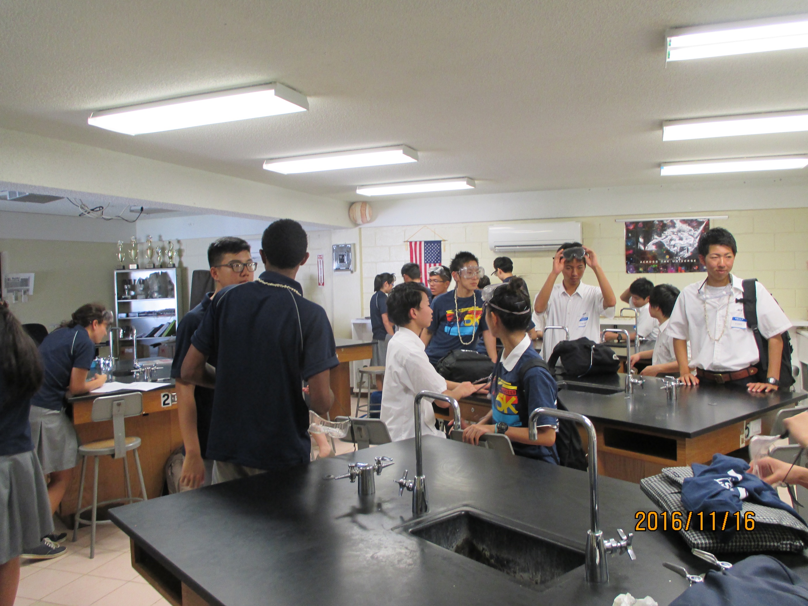修学旅行3日目は、修学旅行のメーン・イベントである「学校交流」と「販売実習」の日です。 朝食を済ませ、8時半にハーベスト・クリスチャン・アカデミーへ向かいました。昨日は突然のスコールに見舞われましたが、今日はスタート時点からの晴天でした。 ハーベスト高校に到着すると、学校交流担当のYOH先生らが迎えてくださいました。まず最初に校内にあるチャペルにハーベスト高校の生徒と一緒に入り、Nagengast校長から紹介をいただきました。続いて神戸市出身でグアム在住の高校1年の女生徒から歓迎の言葉をいただき、高校生らと一緒に歌を歌ったり、講義を聴いたりしました。その後、体育館会議室へ移動し、ハーベスト高校生の合唱を披露してくれました。そしていよいよバディ(パートナー)と対面。そして、アイスブレイクの時間です。お互いにプレゼント交換や自己紹介をした後、体育館で日本から持って行ったけん玉大会やスポーツ交流(バスケット大会)を楽しみました。昼食は、バディと一緒にオープンテラスでランチを一緒に食べました。すっかり打ち解けたところで、ハーベスト高校の授業に参加させていただきました。それぞれ5人ずつのグループに分かれて化学や生物、英語や地理などの授業に参加し、海外で高校の授業をしっかりと体験することができました。(左の授業風景)このような体験はしたくてもなかなかチャンスがなく、生徒達の良い財産になったのではないかと思います。その後ホテルに一旦帰り、16:15からのナイト・マーケットの準備をし、チャモロ・ヴィレッジへ出発。 ナイト・マーケットでは、用意した品物をテーブルに並べ、懸命に販売実習を行いました。つたない英語を駆使して、生徒たち一人一人が大きな声を出して頑張っていました。途中、突然のスコールにも負けず傘を差しながらの販売実習でしたが、雨もすぐにやみ沢山のお客さんが商品を買ってくれました。実習を終える頃にはテーブルの上にあった商品も残り少なくなっていました。全員で集合写真を撮り、後片付けをして販売実習を終了しました。総売上金額は235ドルでした。売上金については、現地のメイク・ア・ウイッシュ財団へ明日の午後、寄付をする予定です。 途中、体調を崩した生徒もいましたが、最後は全員そろって予定を終了することができ、良かったと思います。