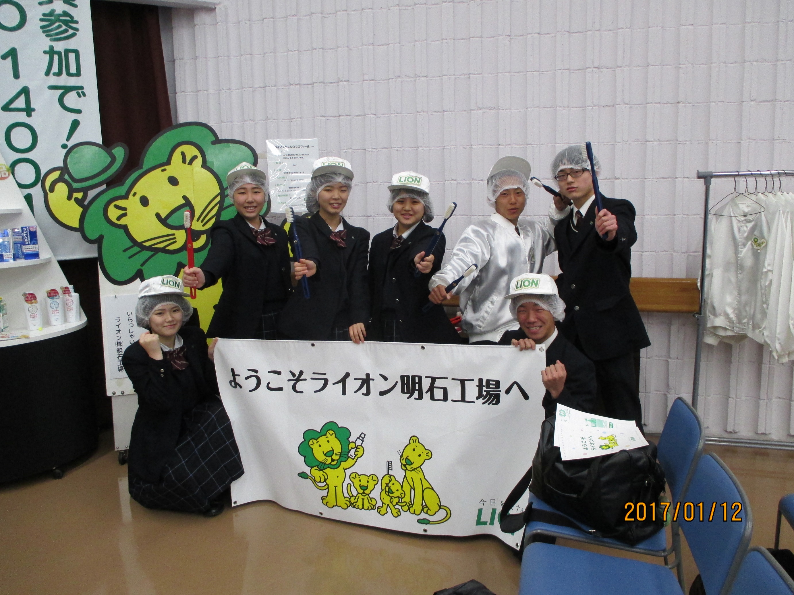 1月12日(木)に2年生国際会計科の生徒が就職研究の一環として企業訪問を実施しました。午前は「ライオン株式会社明石工場」 を訪問し、企業の概要説明や見学の説明を受けた後、工場を見学しました。工場内では歯ブラシや歯磨きなどの製造を行っていたため、衛生面には大変気を遣われていました。工場に入る前、身体にエアーを吹きつけて塵や埃を吸い取ったり、頭のキャップや靴カバーをしての見学でした。工場はオートメーション化されており、あまり人の姿はありませんでしたが、最後の点検ではやはり人の手によって検査されていました。 午後からは「キャタピラージャパン明石工場」 を訪問しました。まず最初に企業で行っている原価計算の講義を受けました。学校で習っている原価計算の教科書に沿った形で説明して頂き、わかりやすい講義で大変参考になりました。昼食はお弁当を用意して頂き、社員の方々と一緒に懇談しながら食事をしました。普段は聞けないような話も聞くことができ、有意義な時間を過ごすことができました。食事後はいよいよ工場見学です。まず工場の広さに驚きました。普段は見ることができないキャタピラー機械の製造工程を見せて頂きました。特に油圧で動くアームの心臓部でもあるバルブの製造は、クリーンルームで行っており、以前テレビで見た「下町ロケット」を思い出しました。工場内はライオン㈱と同じようにオートメーション化されていましたが、最後の組み立ては一つ一つ丁寧に人間の手によって組み込まれており、製造に対する姿勢をうかがい知ることができ大変驚きました。 就職に対する心構えから各社の事業内容など熱心に耳を傾けていました。例年以上に真剣な姿勢で講義や見学を行い、レポートを記入している姿勢が伺えました。盛りだくさんの行事でしたが、この経験を各自の進路指導に活かしてほしいと思います。
