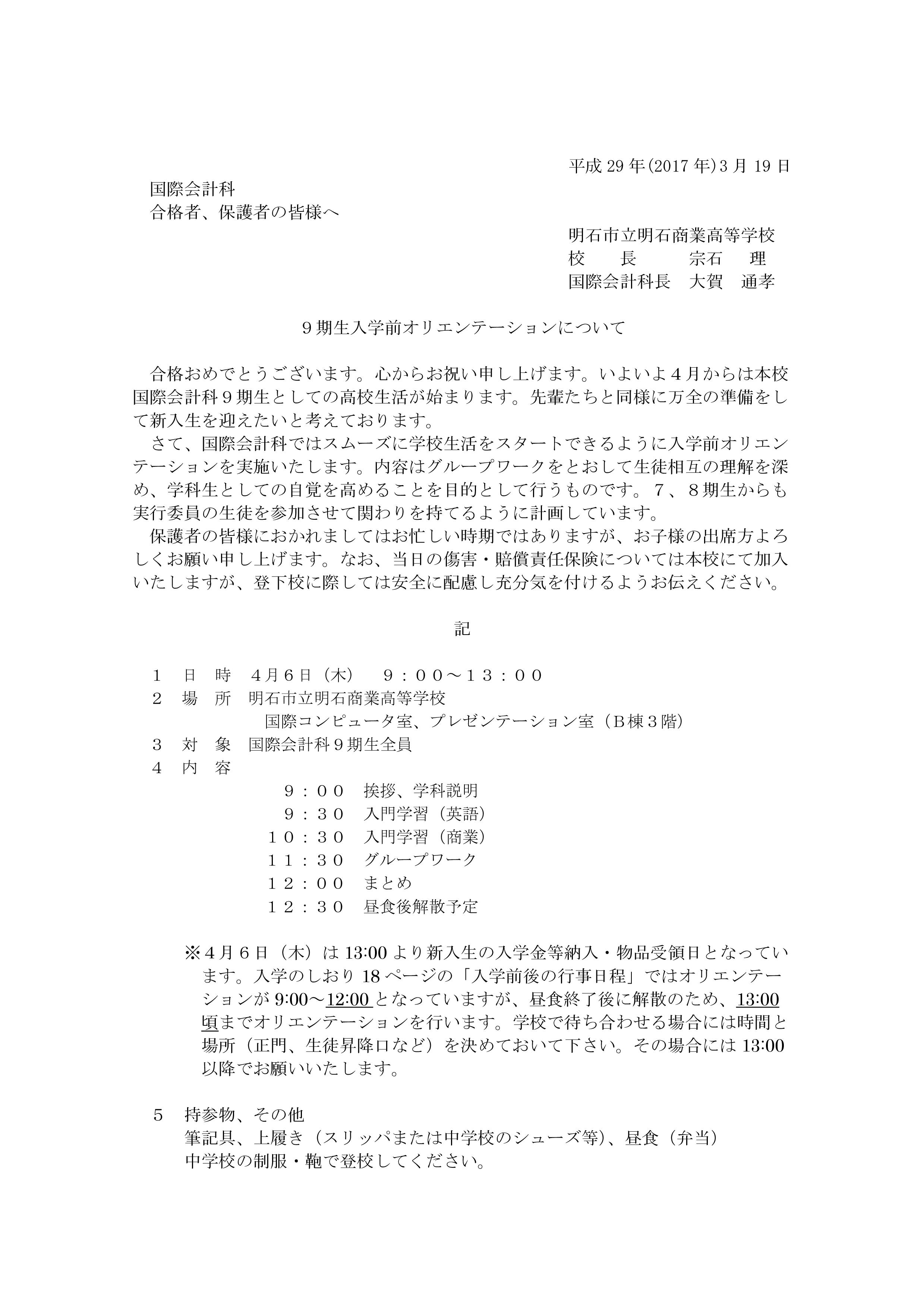 国際会計科では、いち早くスムーズに学校生活をスタートできるように入学前オリエンテーションを4月6日(木)9時より実施いたします。詳細は、下記のPDFファイルをご覧ください。