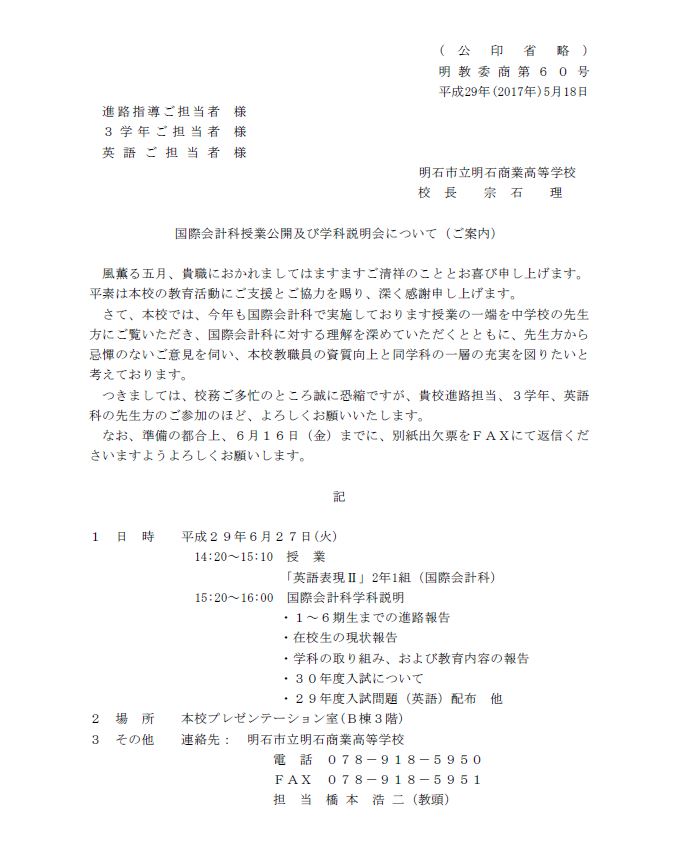 風薫る五月、貴職におかれましてはますますご清祥のこととお喜び申し上げます。平素は本校の教育活動にご支援とご協力を賜り、深く感謝申し上げます。 さて、本校では、今年も国際会計科で実施しております授業の一端を中学校の先生方にご覧いただき、国際会計科に対する理解を深めていただくとともに、先生方から忌憚のないご意見を伺い、本校教職員の資質向上と同学科の一層の充実を図りたいと考えております。 つきましては、校務ご多忙のところ誠に恐縮ですが、貴校進路担当、3学年、英語科の先生方のご参加のほど、よろしくお願いいたします。 なお、準備の都合上、6月16日(金)までに、別紙出欠票をFAXにて返信くださいますようよろしくお願いします。 記 1 日 時 平成29年6月27日(火) 14:20~15:10 授 業「英語表現Ⅱ」2年1組(国際会計科) 15:20~16:00 国際会計科学科説明 ・1~6期生までの進路報告 ・在校生の現状報告 ・学科の取り組み、および教育内容の報告 ・30年度入試について ・29年度入試問題(英語)配布 他 2 場 所 本校プレゼンテーション室(B棟3階) 3 その他 連絡先: 明石市立明石商業高等学校 電 話 078-918-5950 FAX 078-918-5951 担 当 橋 本 浩 二(教頭)