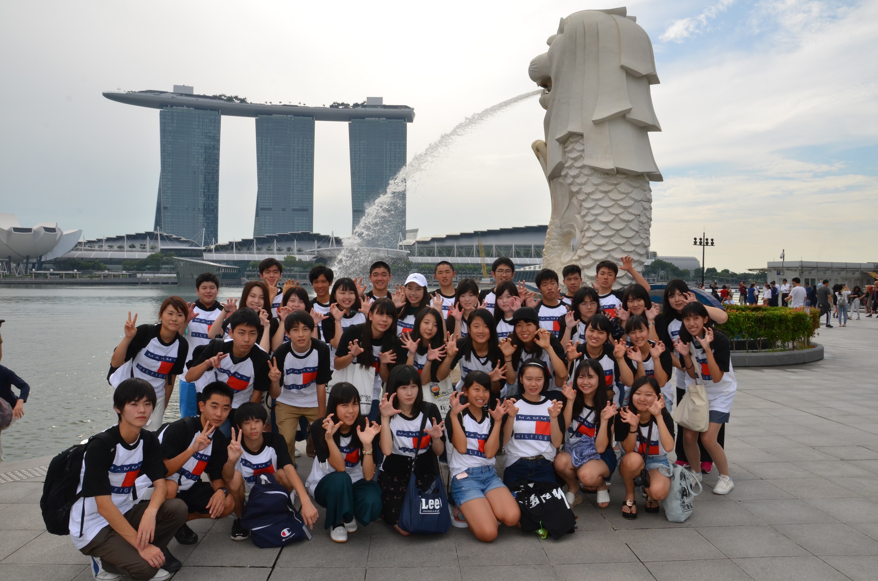 今日は朝から雨模様ですが、出発する前には雨も上がりました。雨上がりの蒸し暑い中ですが、ラッフル卿銅像前にて写真を一枚。シンガポールの町並みを見ながら次はマーライオン公園へ。全員クラスTシャツを着て、はいABC~~(左の写真)でパチリ。港を隔ててマリーナ・ベイ・サンズが見え、最高のロケーションです。雨が上がって良かった!!集合写真の後はマーライオン公園を散策し、セントーサ島に向かって出発です。セントーサ島では、それぞれ前もって選んだアクティビティー(プールorUSS)を体験・満喫しました。夕食はセントーサ島のHard Rock Cafe!大きなハンバーグを思いっきり頬張り、お腹一杯になりました。その後、セントーサ島を後にし、一路ガーデンズ・バイ・ザ・ベイへ。OCBCガーデン・ラプソディー(光のショー)を見学。巨大なツリーが音に合わせて輝く様子は圧巻!!まるで夜空に浮かぶ宇宙要塞のようでした。その後ヨークホテルに帰り室長会議、就寝です。明日はマレーシアのジョホールバルへ行き学校交流です。初めての陸路を使った国境越えや、どんなバディーと巡り会えるかなどなど・・・、楽しみです。体調不良者が一人もでず、みんな元気に修学旅行を満喫しています。