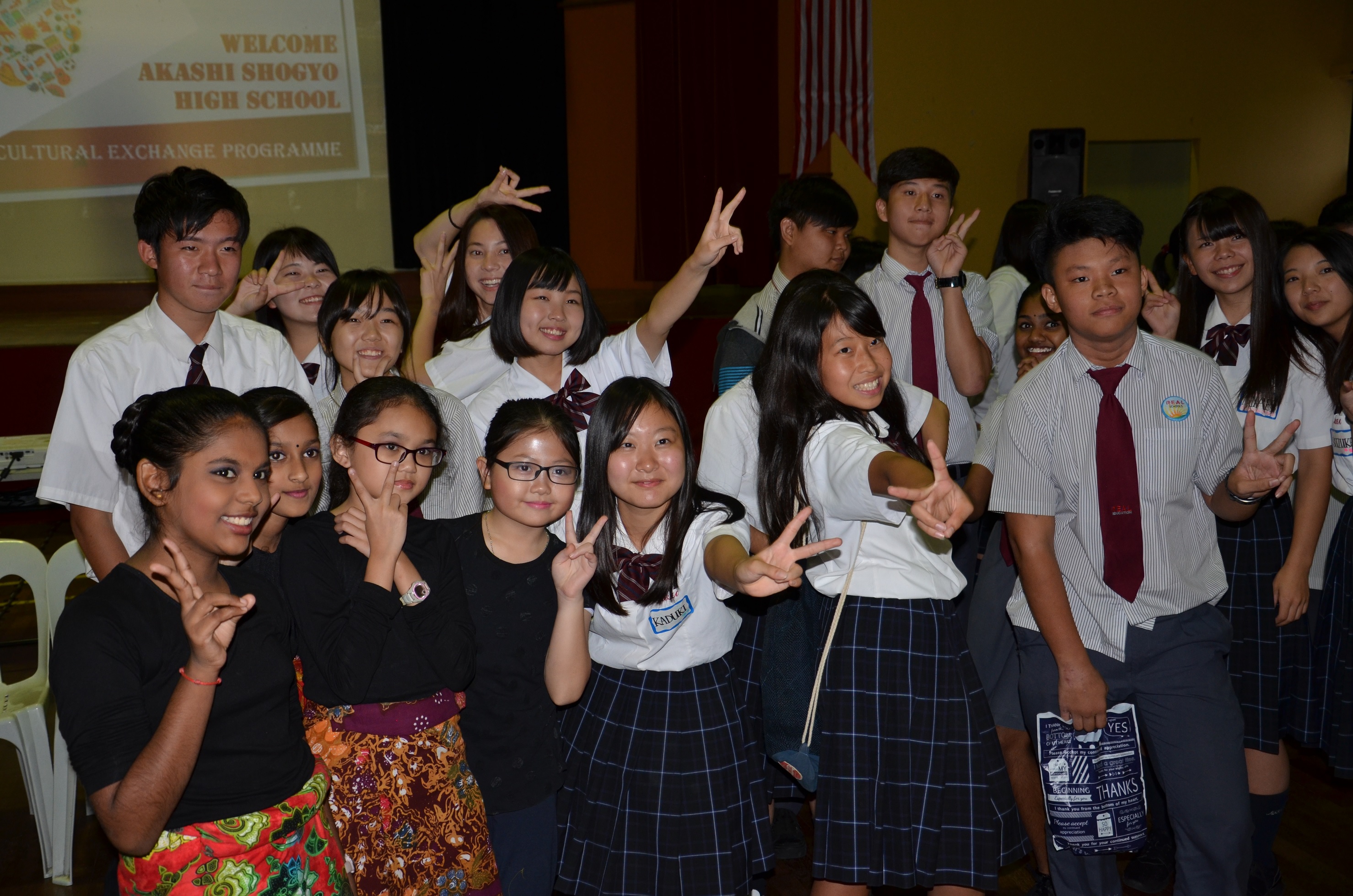 修学旅行3日目は、今回の旅行のメーン・イベントである「学校交流」の日です。しかし、今日は朝早くから雷が鳴り、雨が沢山降っています。この日のためにみんなで力を合わせて、幾度となく練習を積み重ねてきたので、その力が発揮できるよう頑張ってほしいと思います。ホテルを出発して、一路マレーシアへ向けて進んでいるとシンガポールとマレーシアとの国境付近で、出入国管理局が行く手を阻みます。陸路での国境越えは、みんな初めての経験です。シンガポールの管理局で、それぞれパスポートと手荷物を持ってバスを降り一人一人が出国、そしてまたマレーシアの管理局で入国の手続きです。少し緊張した面持ちで手続きを終えると、やっとマレーシアのジョホールバルへ入国です。さあ、気持ちは「Real School Cahaya Compus Johor」との学校交流です。15分ほどでReal Schoolへ到着。セレモニー会場へ通されると、生徒達が歓迎のお出迎えです。自分たちのバディを見つけ隣に座り自己紹介の後、プレゼントの交換などをしました(写真左)。次に、お互いの校長先生の挨拶、記念品の交換をしました。続いてReal Schoolの生徒達が歓迎の太鼓や歌、踊りなどを披露してくれました。そしていよいよ私たちの番です。電卓の早打ち妙技を見ていただいた後、明石市や明石商業高校・また明石市の特産品についてプレゼンをし、次にダンスの披露です。手拍子もしていただき結構盛り上がりを見せて、なんとか成功裏に終了しました。その後、校内の見学や軽めのランチを頂き「Real School Cahaya Compus Johor」との学校交流も終了です。最後は生徒全員に見送っていただき、別れを惜しんで、バスの中からいつまでも手を振っていました。 ジョホールバルのレストランでマレーシア料理に舌鼓、その後同じルート(国境越えも少しなれてきました)でホテルに帰り、約2時間の休憩です。17:30にホテルを出発し、次は「ナイト・サファリ」へ。ナイト・サファリで夕食(味噌汁と巻き寿司があったぞ~~!)を済ませ、ファイヤーショーを見てからトラムに乗ってサファリへ・・・。やはり夜見る獣たちは、昼間とは違った表情を見せ、非常に興味深い見学でした。その後、ホテルへ帰りシンガポール最後の夜を過ごしました。明日は全員そろって、カバンと胸に一杯お土産を詰めて、元気に日本に帰りま~~す。