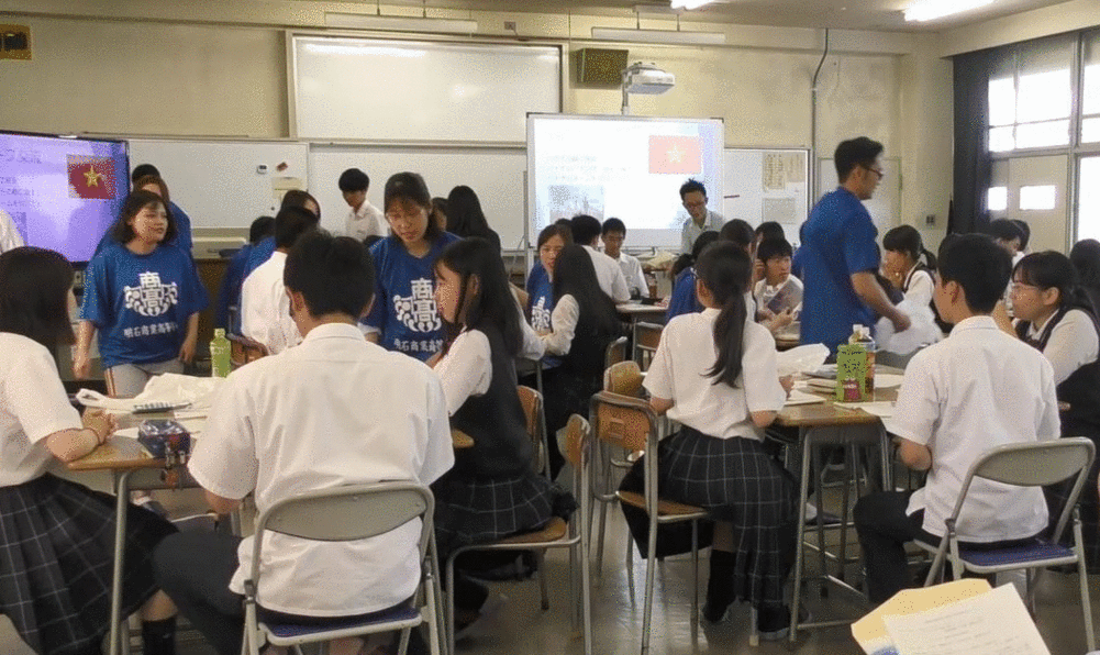 6月27日(水)5,6限目に本校プレゼンテーション教室にて「国際理解」授業の一環として、流通科学大学の留学生(ベトナム、カンボジア、ミャンマー、マレーシア等)18名と3年1組の生徒が国際交流を行いました。 本年度3年1組の生徒はベトナムについての学習を「国際理解」の授業内で行っており、学習過程で生じた疑問を直接ベトナム人に聞いてみたいという生徒たちの要望から今回の交流が実現しました。 交流では、明石と明商に関するプレゼンテーションを英語で行った後、ベトナムへ修学旅行に行くと仮定して作った自主研修の行程を留学生に対して発表しました。本校留学生のケイトリンも日本語で発表をしました。その後留学生よりベトナムに関するプレゼンをして頂き、ベトナムに関する知識をさらに深めた後、電卓対決として、本校計算事務部の部員と流通科学大学留学生が対決しました。留学生からは「日本人の高校生は電卓を使わないと聞いていたのでびっくりした」と感想を頂きました。最後にグループ交流をし「日本の高校生とベトナムの高校生の違いは」「ベトナムで流行しているものは」などと質問した後、ベトナムネームを留学生からつけてもらいました。最後にベトナム語と英語で挨拶をしました。 その後中学校の先生方に対して学科説明会を行い、国際会計科に対して貴重なご意見をたくさん頂きました。ご意見を参考にしてより良い国際会計科になるようさらなる努力をしていきたいと思います。(国際会計科副科長 西真未) . .