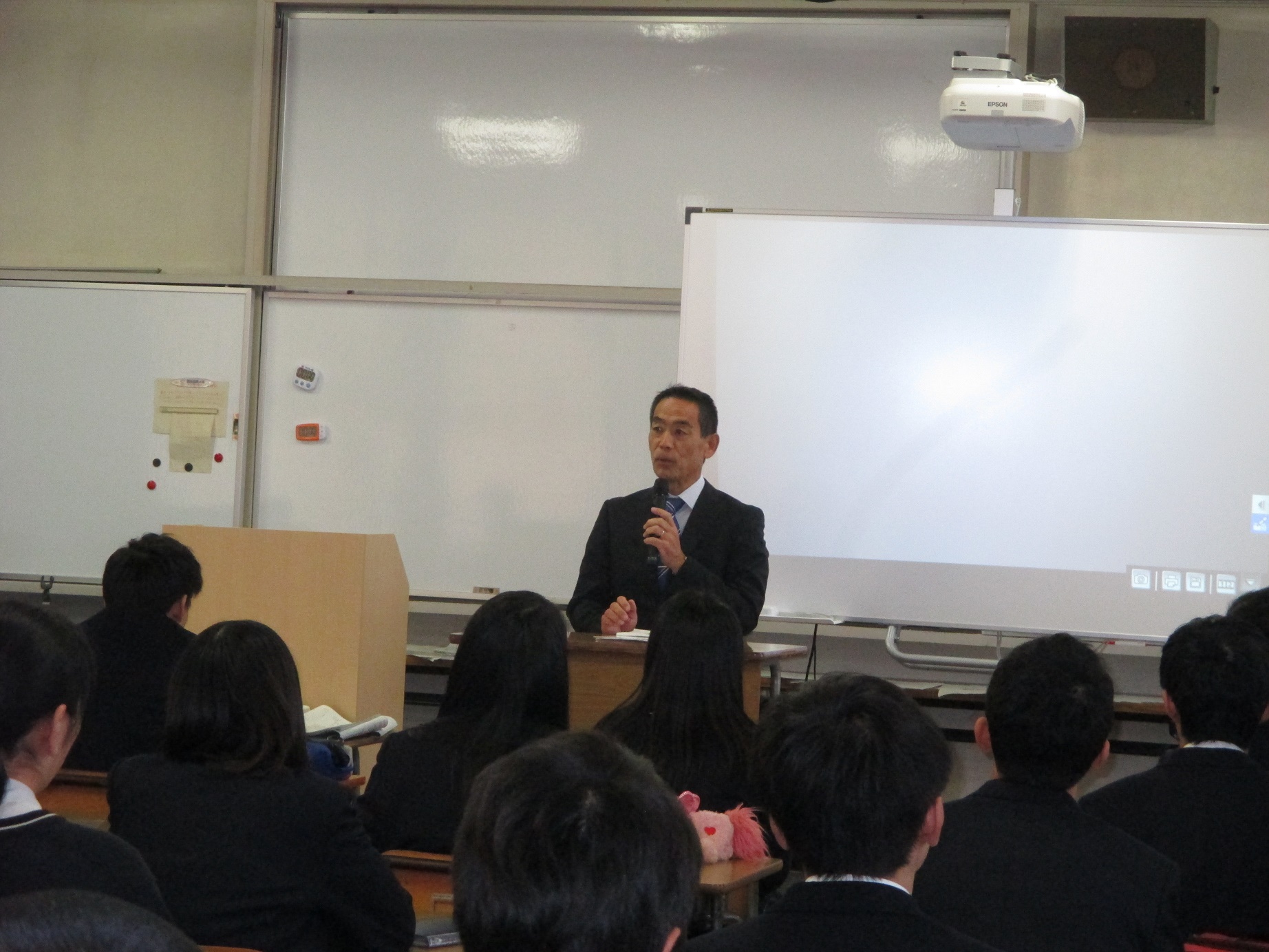 結団式 11月12日(月)11:55からB棟3階のプレゼンテーション室にて、国際会計科2年生1組「修学旅行結団式」を行いました。学校長より「結団宣言」があり、修学旅行に対する心構えや、グアムで色々な経験を通して大きく成長し、全員無事に帰ってくるよう話して頂きました(左の写真)。また、学年主任から修学旅行に向けての諸注意、安心・安全に行えるよう一人一人自覚を持って行動するようにとの話の後、東武トップツアーズの原様より旅行の諸注意と日程についてなど、また、養護教諭より健康面に対する諸注意など、最後に担任から旅程表の確認と諸注意を、生徒達も明日(11/13)からの3泊4日グアム修学旅行に向けて、期待や不安など入り混ざった気持ちで真剣に話を聞き、修学旅行に対する意気込みを感じる事ができました。 さぁ~、明日からの修学旅行全員そろってすてきな思い出を作りましょう~~。
