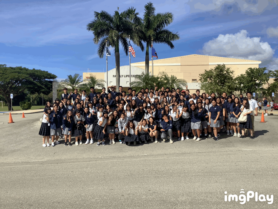 今日は、修学旅行最大のイベントである学校交流と販売実習です。朝食後、直ぐに支度をして、ハーベストクリスチャンアカデミーへ出発しました。予定通り到着し、講堂にてパートナーと初対面です。両校の生徒とも少々緊張気味。ハーベスト高校からの挨拶の後、半年間準備してきたプレゼンを行いました。その後本校の校長先生が英語で挨拶し、記念品を贈呈しました。その後体育館でスポーツ交流をしました。まずはアメリカの鬼ごっこでウォームアップ。そしてバレーボールやバスケットボールなどの交流をして少しずつ打ち解けてきました。昼食は、カフェテリアにて用意していただいた食事をバディと一緒に食べながら交流です。簡単な英語と身振り手振り、持参した用紙と筆記用具でお互い意思疎通を図りました。なんとか会話が成立し、その気になれば何とかなることが改めて分かりました。その後、バディと授業参加です。さすがに授業は、理解することは難しかったですが、貴重な経験ができたと思います。最後に日本語クラス履修の生徒との交流会を行い、全員で記念撮影し、ハーベスト高校を後にしました。中には夜のチャモロナイトマーケットの告知をした生徒もいて準備していたことをしっかり実践できて大変よい交流会になりました。 ホテルに帰着後、休む間もなく次のイベントである販売実習の準備に取り掛かります。この日のために準備した日本から持参した物品を$1で販売しました。売れ行きが伸びない時間帯もありましたが、午前中のハーベスト高校での経験が生き、各自が積極的に動き、販売しました。あっという間に人だかりができ、飛ぶように商品が売れていきます。午前中に交流していたハーベスト高校からも来てくれて感動です。日本から準備していた商品は、完売。大成功です。収益金$163は明日、ホテルに来ていただけるMAKE A WISHへ贈呈します。 会話力としての英語の能力も必要です。しかし、相手に自分の意思を熱意をもって伝えることは、日本人同士だけでなく、外国の方にも欠かせないものだということを認識させられた一日でした。日本に帰国後もそのことを忘れず、語学の習得や国際交流、コミュニケーション能力に力を入れてほしいと思います。