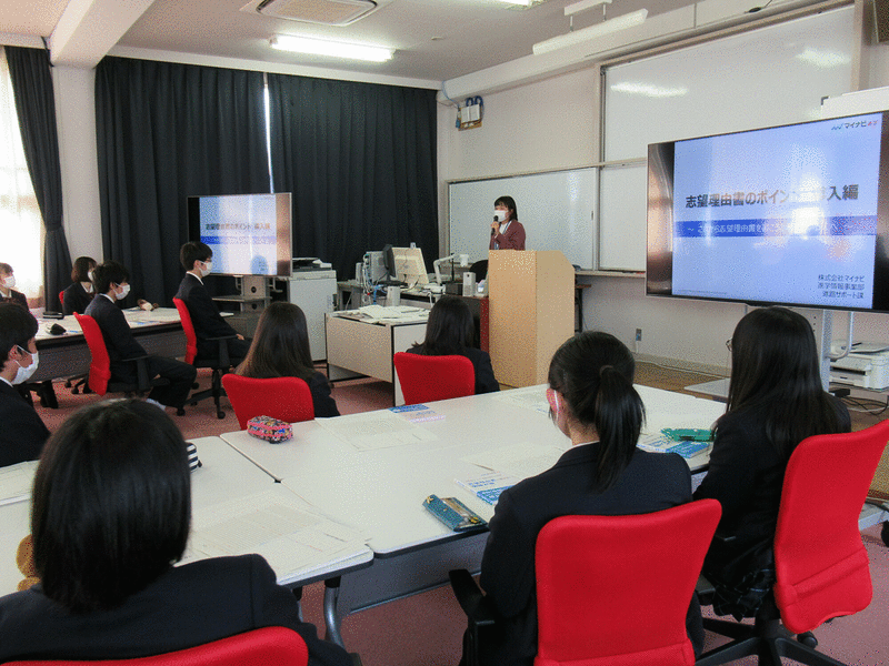 2月8日(月)の5、6時間目を使って2年生国際会計科の生徒を対象にマイナビの中村様より進路講演会を実施して頂きました。前回は、12月に国際会計科の1年生を対象に実施して頂き、今回は学年を変えて2度目の実施になります。2年生は、来春の進路実現に向けて1年生の内容より具体的に踏み込んで、志望理由書講座を実施しました。まず自己評価から自分のことを見つめ直し、どんなことに興味があり、何が得意で、将来はどうなりたいのか。そして、そんな自分は進路先で何をしたいのか、進路先のどこに魅力を感じたのかなど頭の中で考えるだけでなく、ワークシートを活用して志望理由書の基本的な考え方についてレクチャーして頂きました。自分を評価することは難しく悪戦苦闘しましたが、自分の進路実現のため全員意欲的に取り組んでいました。その他にも進路先研究の手法などこれからの進路について真剣に考える時間を頂き、大変有意義な時間になりました。次回は3月5日(金)に志望理由書模試を実施し、その後、添削されて戻ってきた答案を見直して、よりグレードアップした志望理由書を書くためのフォロー講義も実施して頂きます。2年生は、来年の春に希望の進路が実現できるようこれからも継続して積極的に行動してくれることを期待しています。