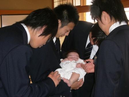 本日3・4校時(3年6組)5・6校時(3年7組)の家庭科で「赤ちゃんを抱っこしよう」の授業がありました。小さな妹・弟がいる生徒も、そうでなく、初めて抱っこする生徒も、みんな上手に「抱っこ」できました。