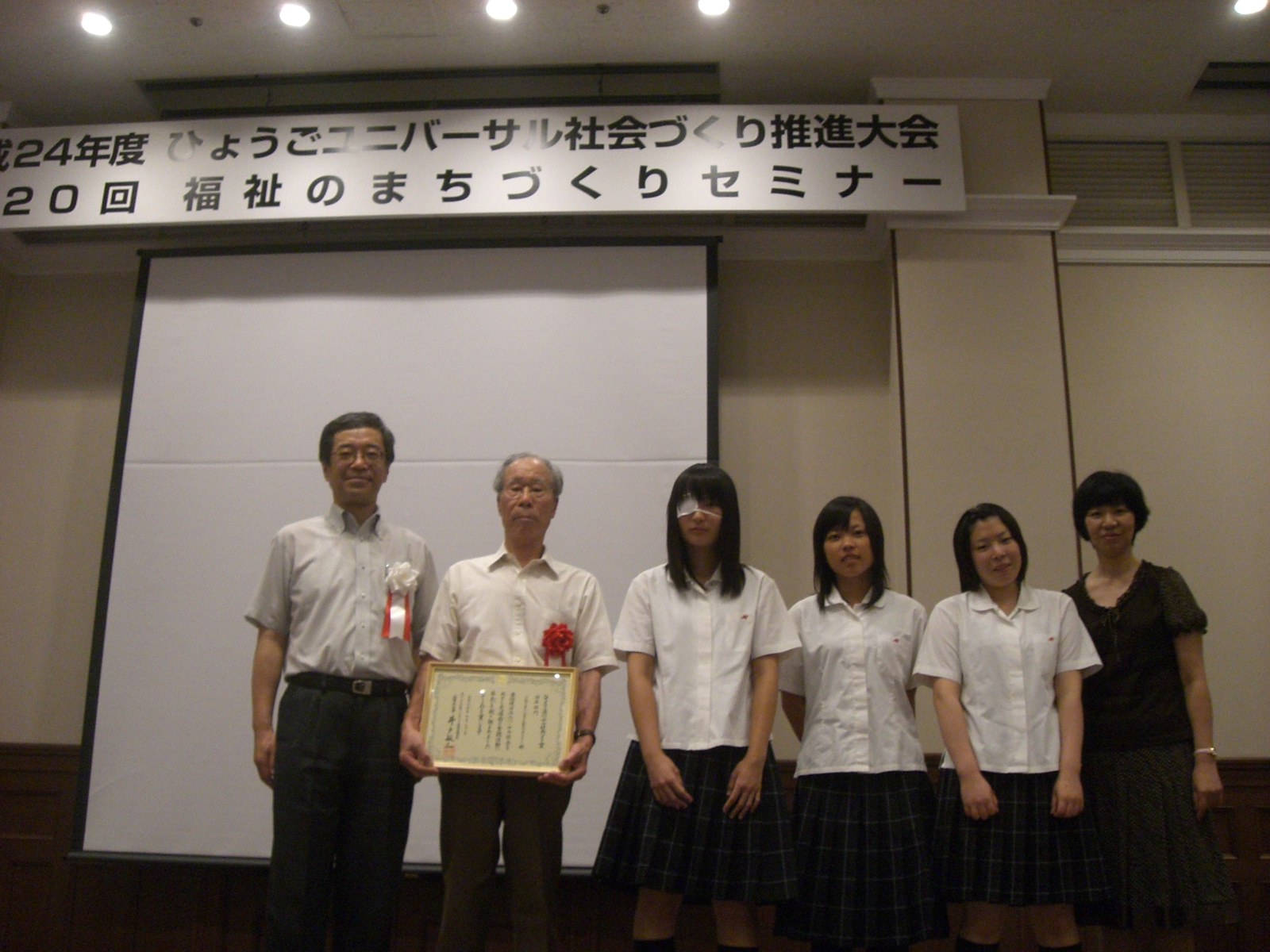 兵庫県公館にて、平成24年度ひょうごユニバーサル社会づくり賞の贈呈式があり、本校から家庭科部が代表出席しました。「うおずみんふるさと創生プロジェクト」での本校と明石高専、明石清水高校との学校間連携としての「ヤングうおずみん」の活動が評価されたものです。式典では本校生徒会、家庭科部、家庭科の授業での取り組みが紹介されました。