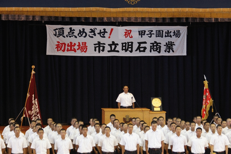 7月31日(火)、8月5日から開幕する夏の全国高校野球に出場する野球部の伝達表彰と壮行会が本校体育館にておこなわれました。 堀生徒会長が「甲子園出場おめでとうございます。万全の状態で試合に臨み、明商らしいプレーをしてください。生徒全員で応援しています。」と激励のことばを述べ、続いて楠田校長先生から「甲子園でも粘り強く、西兵庫の代表としての品格を持ち、明石に明商ありと全国に発信すると同時に一戦必勝のおもいで、多くの方々への感謝の気持ちを胸に全力で取り組んでください。健闘を期待しています。」と激励しました。右田主将は「私たちは、日々厳しい練習をし、周りの人に感謝して129名全員野球で、一つでも多く勝ち切れるよう、最善を尽くして戦います。応援よろしくお願いします。」と決意を述べました。 壮行会のあと、選手たちは「甲子園見学」に出かけました。18人の選手はグラウンド内の各ポジションに立ち、待ちに待った甲子園で活躍することを誓ったことと思います。 夏の全国高校野球は、8月2日 16時より大阪フェスティバルホールにて組み合わせ本抽せんが行われ、3回戦までの対戦が決まります。開会式は8月5日(日)午前9時から、準々決勝翌日の8月19日は休養日、決勝戦は、8月21日(火)午後2時 となっています。ご支援ご声援よろしくお願いします。
