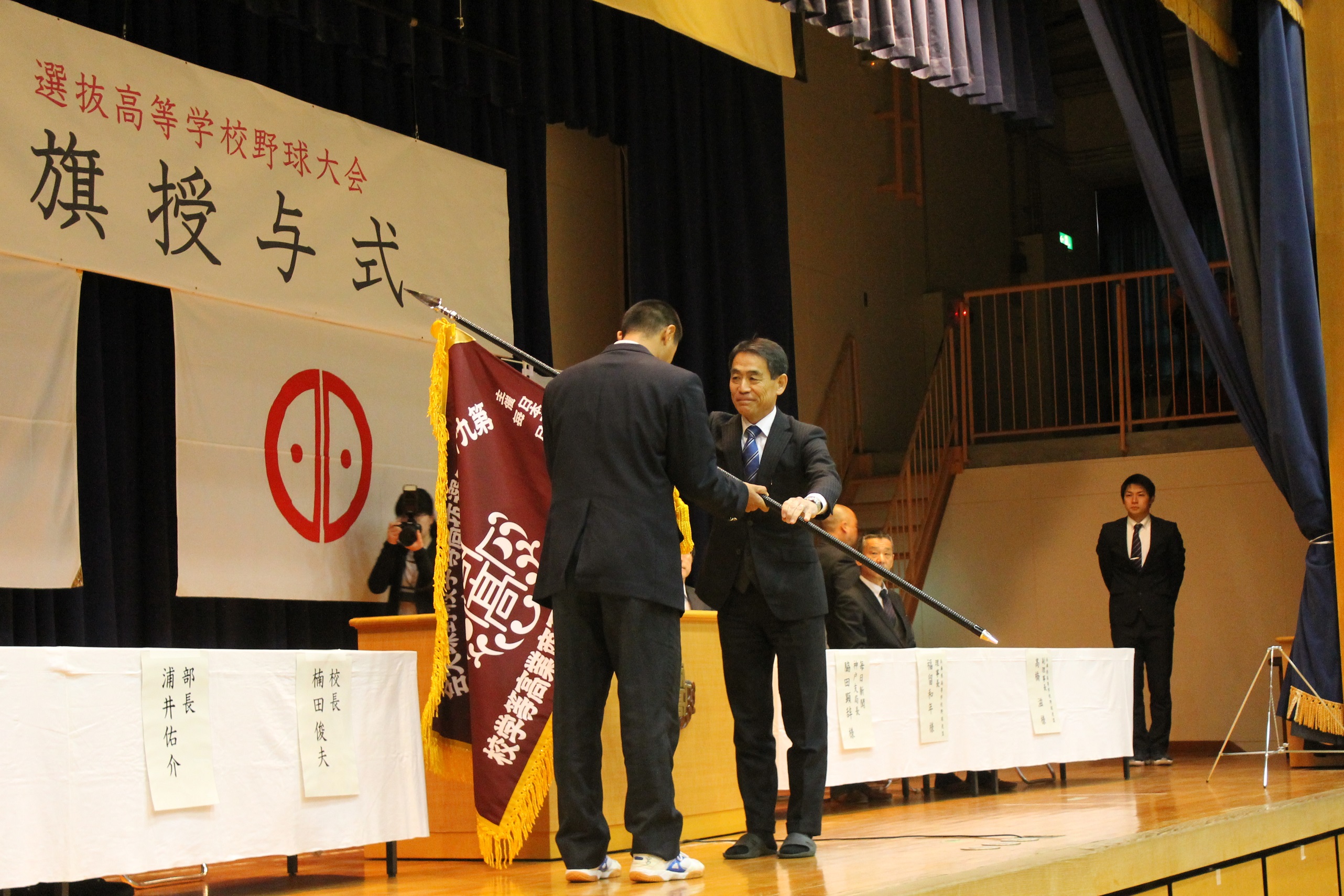 23日開幕の第91回選抜高等学校野球大会開会式の入場行進で掲げる選抜旗の授与式が本校体育館にて行われました。 体育館最前列には1年生と2年生の約80人の野球部員が整列し、明石商業高校の校章が入った選抜旗が、毎日新聞社神戸支局長 脇田顕辞様から楠田俊夫校長を通じて重宮 涼主将に手渡されました。 毎日新聞社社長 丸山昌宏様と兵庫県高等学校野球連盟理事長の福留和年様から激励のメッセージをいただき、重宮主将は「近畿兵庫代表として名に恥じないように全身全霊で頑張りたいと思います。全国の高校球児のお手本となるように戦います。」と決意表明しました。 センバツの組み合わせ抽選は3月15日、開会式は23日に行われます。皆様のご声援をよろしくお願いいたします。