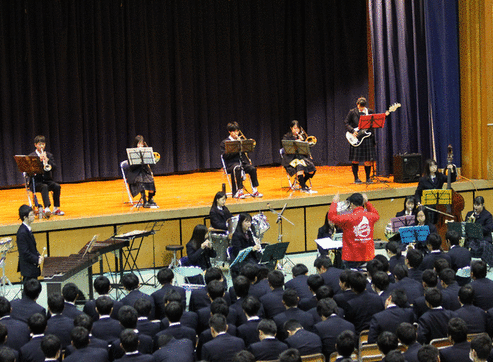 12月20日(金)午前9時より、文化部発表会が行われました。午前中は本校体育館でステージ発表が行われ、吹奏楽部の演奏、有志によるブレイクダンス、3年生の動画作品やプレゼンテーション、新商品等の紹介、邦楽同好会の優雅な演奏、ダンス部による息のあったダンスの披露などが行われました。今回も各学年の先生方と生徒が電卓で計算を競うという計算事務部のステージイベントで大いに盛り上がりました。午前の部の最後はダンス部。息のあった演技で割れんばかりの拍手喝采で午前の部を締めくくりました。 午後は、課題研究で商品開発された商品の販売、家庭科部が作ったクッキーの販売と展示、茶華道部のお茶席、美術部、書道部の作品展はそれぞれにこまやかな創意工夫がなされていました。 来年もいっそう素晴らしい文化部発表会が開催されるように校長先生の講評を載せます。