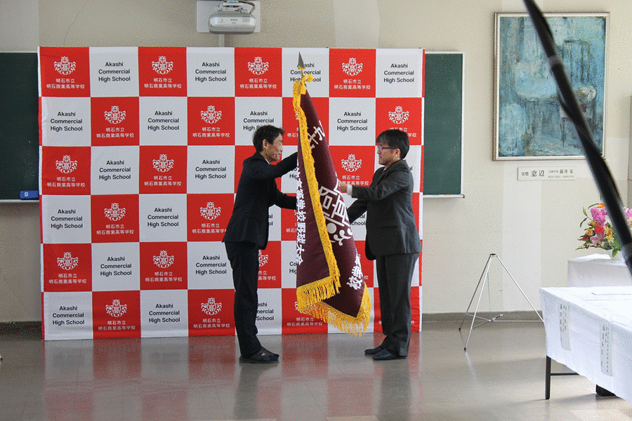 19日開幕の第91回選抜高等学校野球大会の選抜旗授与式が本校にて行われました。下部のリンクのように、通常なら体育館にて在校生と野球部員全員も選抜旗授与式に参加するのですが、新型コロナウイルス感染症対策のため、会議室にて、限られた人数、限られた時間で行われました。 明石商業高校の校章が入った選抜旗が、毎日新聞社神戸支局長 脇田顕辞様から楠田俊夫校長を通して来田涼斗主将に手渡され、毎日新聞社社長 丸山昌宏様と兵庫県高等学校野球連盟理事長の福留和年様から激励のメッセージをいただきました。 来田主将は「選手一同気が引き締まったと思います。コロナウイルスの感染予防を徹底し、今、自分たちでできることを確実にこなし、甲子園では一戦一戦あきらめず粘り強い野球をしていきたいと思います。」と決意表明しました。 センバツの組み合わせ抽選は3月13日、開会式は行われず無観客で19日より大会が開催される予定です。皆様のご声援をよろしくお願いいたします。