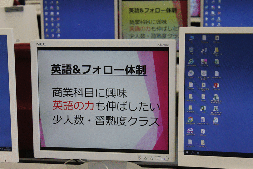 体育館では、生徒会役員によるパワーポイントを利用した学校紹介と制服紹介が行われ、そのあと、商業科の授業体験では、情報処理・電卓の2つの授業、国際会計科の授業体験で商業科目と英語の授業を体験しました。