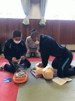 スポーツ科学コースの2年生は、運動部に所属しそれぞれの種目で中心となって活動しています。今日の心肺蘇生法とAED講習を受講することにより、運動中のみならず日常生活においても突然の心停止に対し、第一次救命活動に貢献できる知識と技術を身に付けることができました。