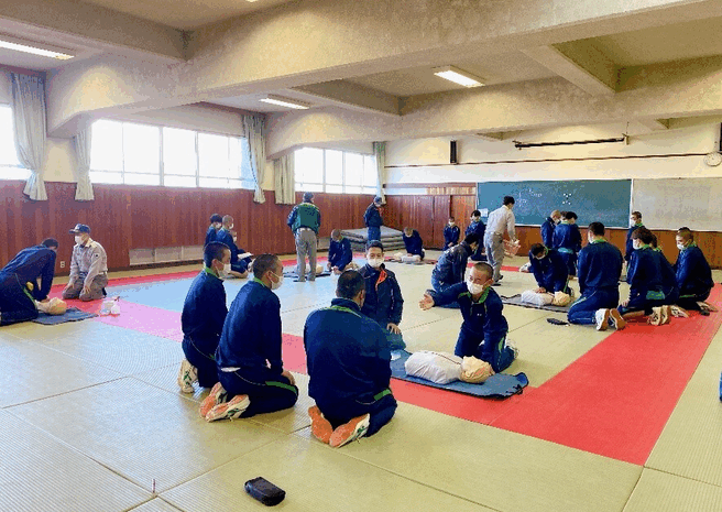 3限からは柔剣道場に移動し、魚住分署から6名の消防士・救急救命士にお越しいただき、心肺蘇生法の胸骨圧迫やAEDの操作方法について実技講習を受講しました。