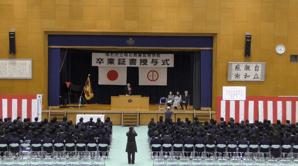 その後、各クラスの評議員の紹介、PTAと同窓会から「印鑑・ふくさ・タンブラーセット」、「卒業証書ホルダー」、卒業式の「コサージュ」が69回生へ贈られました。 卒業記念品贈呈式では、69回生から学校へシャークコードレススティッククリーナー5台が贈られました。