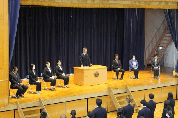 4月9日(火)午前9時より、本校体育館にて、明商を去られる職員の離任式を行いました。本年度は14名の教職員の転退職があり、年度当初の忙しい中7名の先生がお別れの挨拶に来校されました。橋本校長からの先生方の紹介のあと、それぞれの熱い思いを話していただきました。