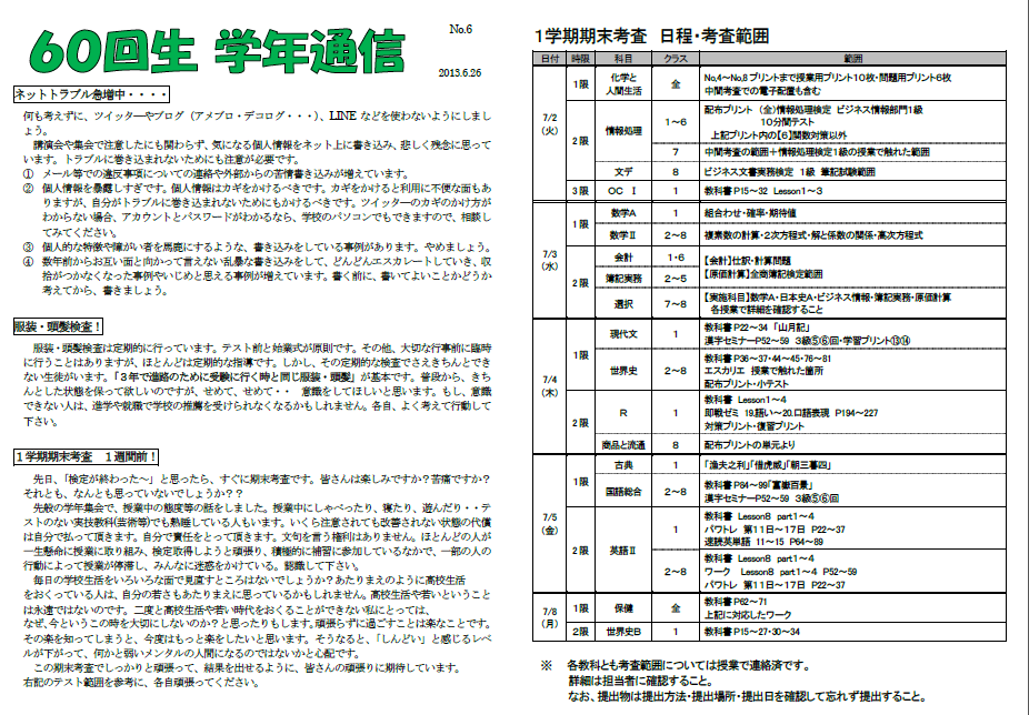 終わりのショートホームルームで2年生の学年通信NO,6を配布しました。