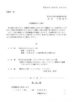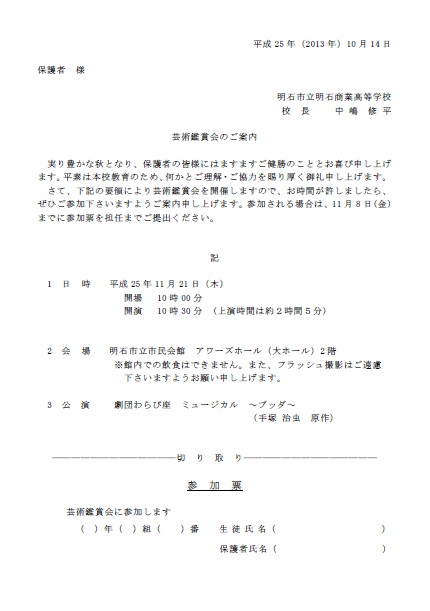 明石市立市民会館(アワーズホール)にて芸術鑑賞会を行います。日時は、平成25年11月21日(木) 午前10時30分より開演です。内容は、劇団わらび座によるミュージカル「ブッダ」(手塚治虫 原作)です。 お時間が許しましたら、ぜひご参加下さいますようご案内申し上げます。 参加を希望される場合は、生徒をとおして参加票を配布しますので、11月8日(金)までに参加票を担任へご提出ください。下記リンクよりダウンロードすることも可能です。 何かとお忙しいとは存じますが、ふるってご参加ください。