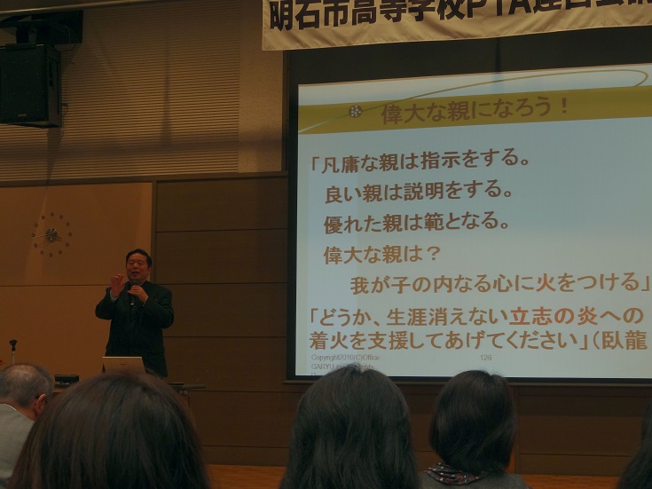 10月19日(土)、明石市高等学校PTA連合会第3回講演会が明石市立産業交流センター多目的ホールで開催されました。 角田識之氏による「志ざし教育」についてのお話でした。スライドを使ったわかりやすい内容でした。(本部)