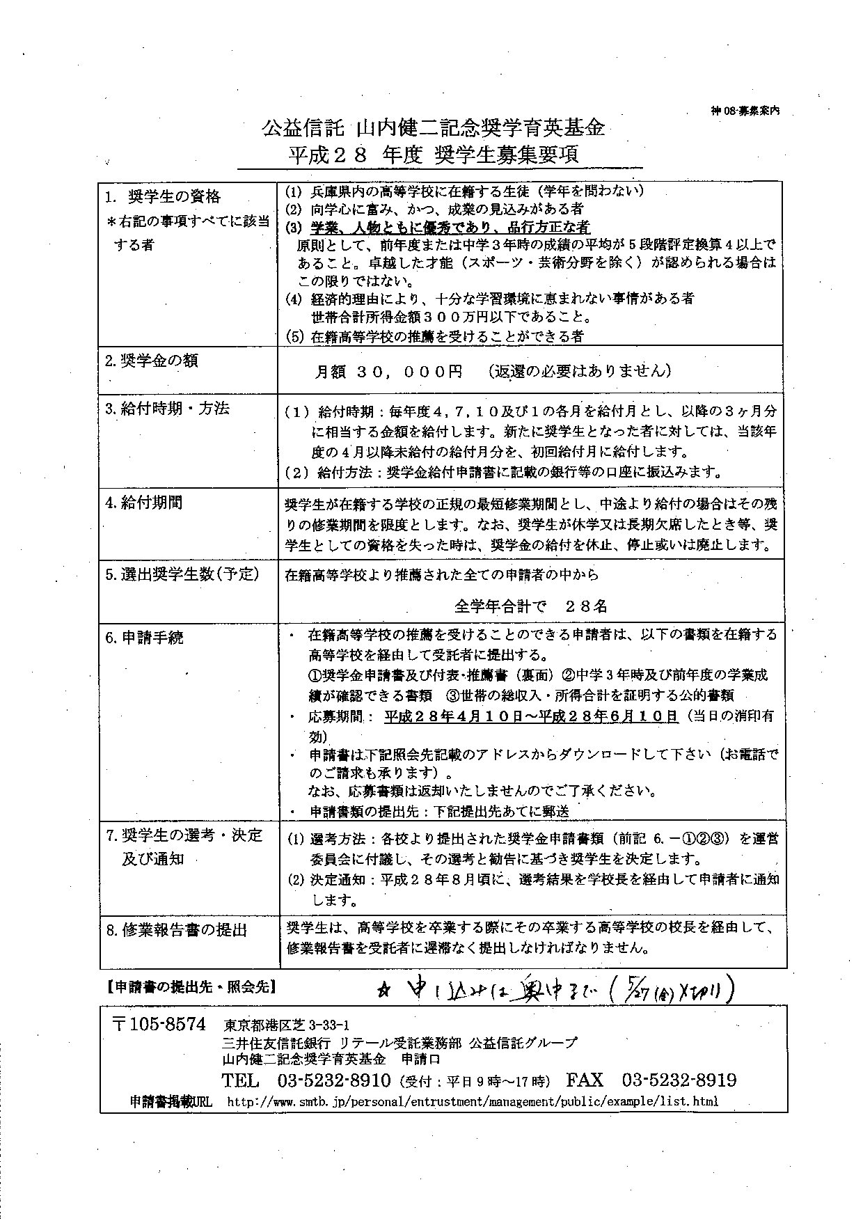 別紙のように、公益信託 山内健二記念奨学育英基金奨学生の案内がきました。詳細は、早急に奥中まで問い合わせ願います。5/27(金)締め切りです。