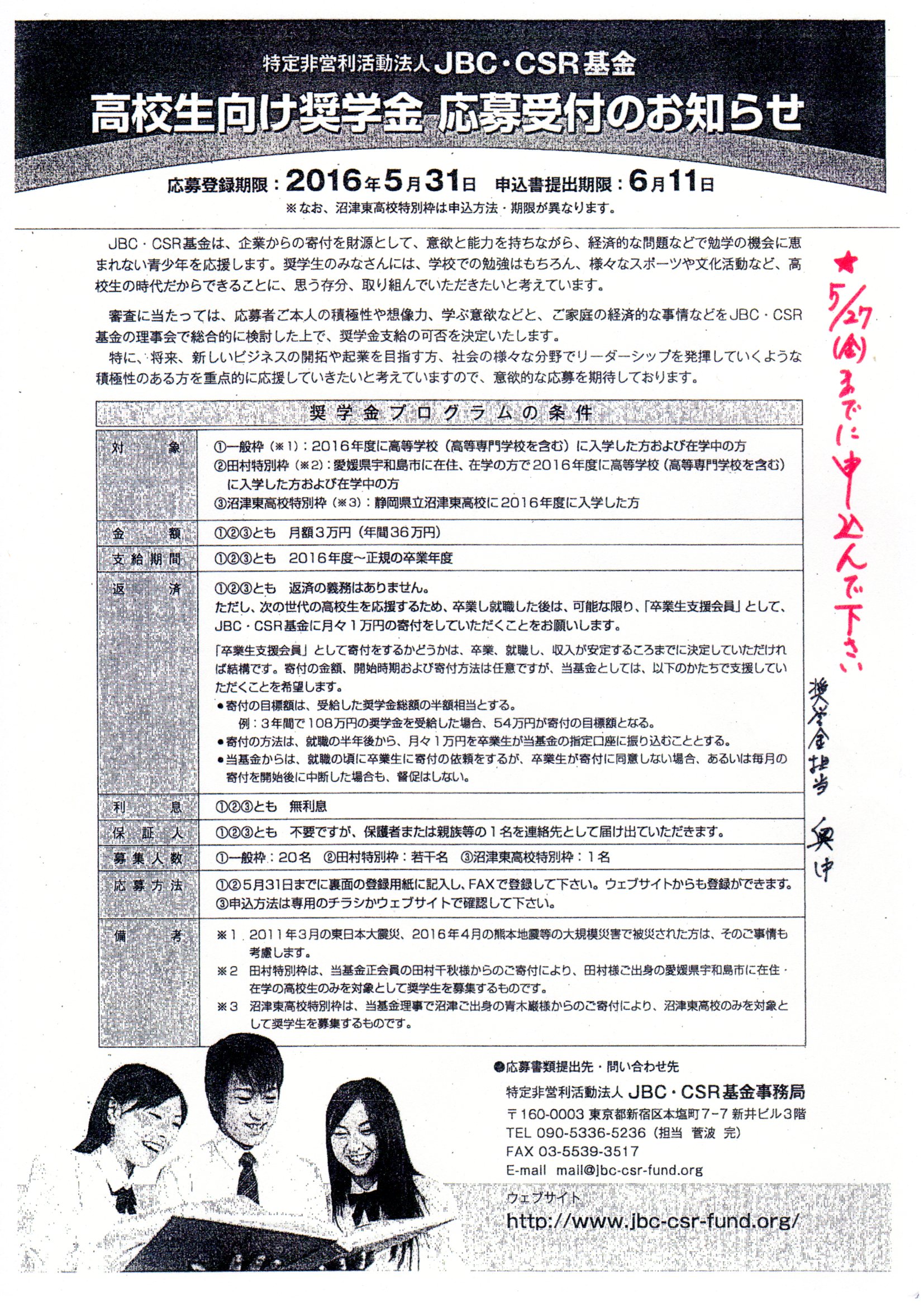 別紙のように、特定非営利法人 JBC・CSR基金 高校生向け奨学金の案内がきました。詳細は、奥中まで問い合わせ願います。5/27(金)締め切りです。