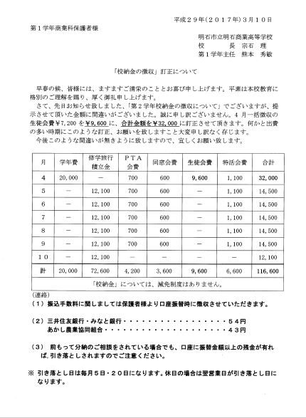 新2年生、新3年の校納金徴収についての案内プリントを配布しました。 新入生については、3月19日に配布する「入学のしおり」の9ページを参照してください。
