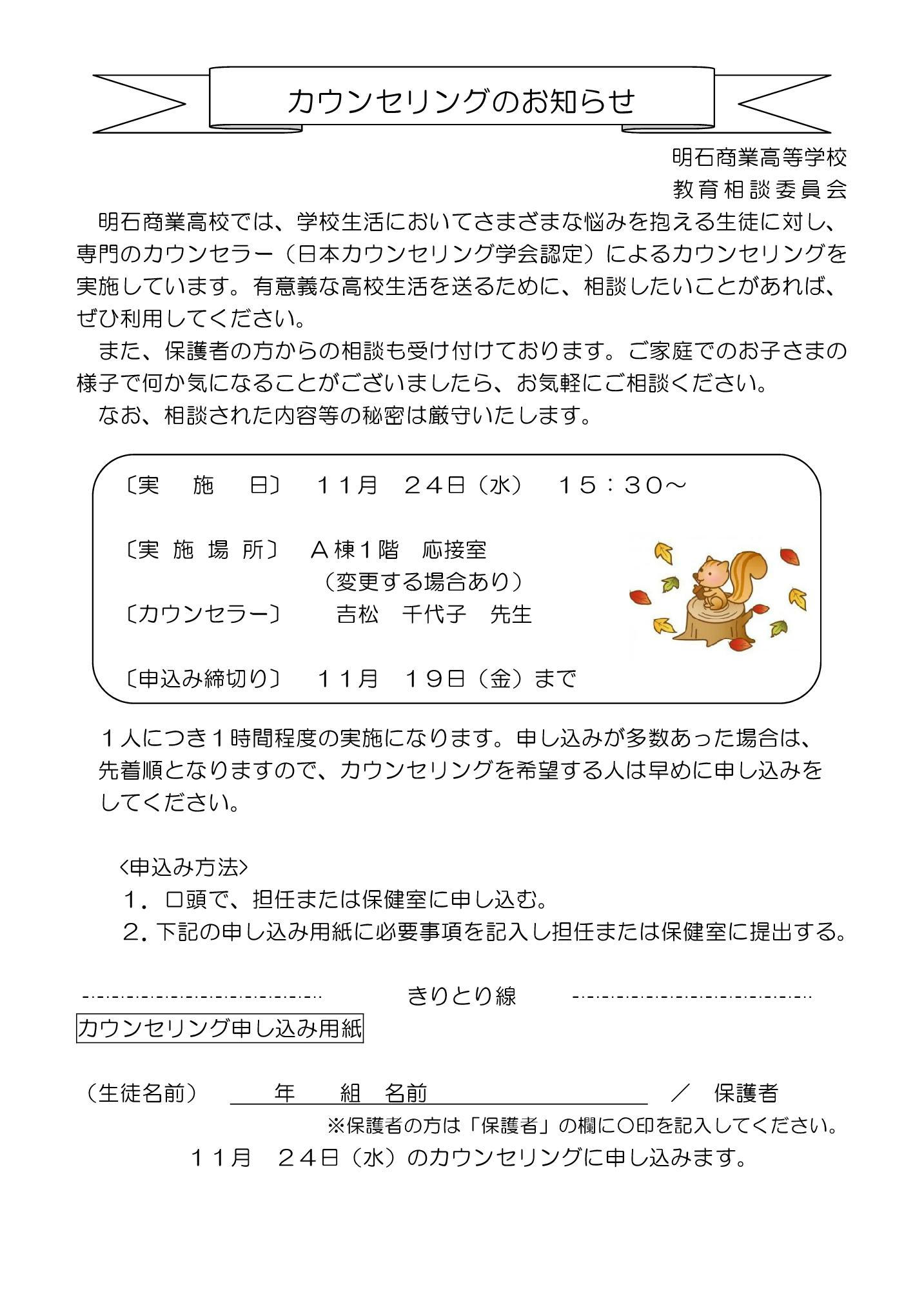 明石商業高校では、学校生活においてさまざまな悩みを抱える生徒に対し、専門のカウンセラー(日本カウンセリング学会認定)によるスクールカウンセリングを実施しています。有意義な高校生活を送るために、相談したいことがあれば、ぜひスクールカウンセリングを利用してください。 また、保護者の方からの相談も受け付けております。ご家庭でのお子さまの様子で何か気になることがございましたら、お気軽にご相談ください。 なお、相談された内容等の秘密は厳守いたします。詳しくは別紙をご覧ください。