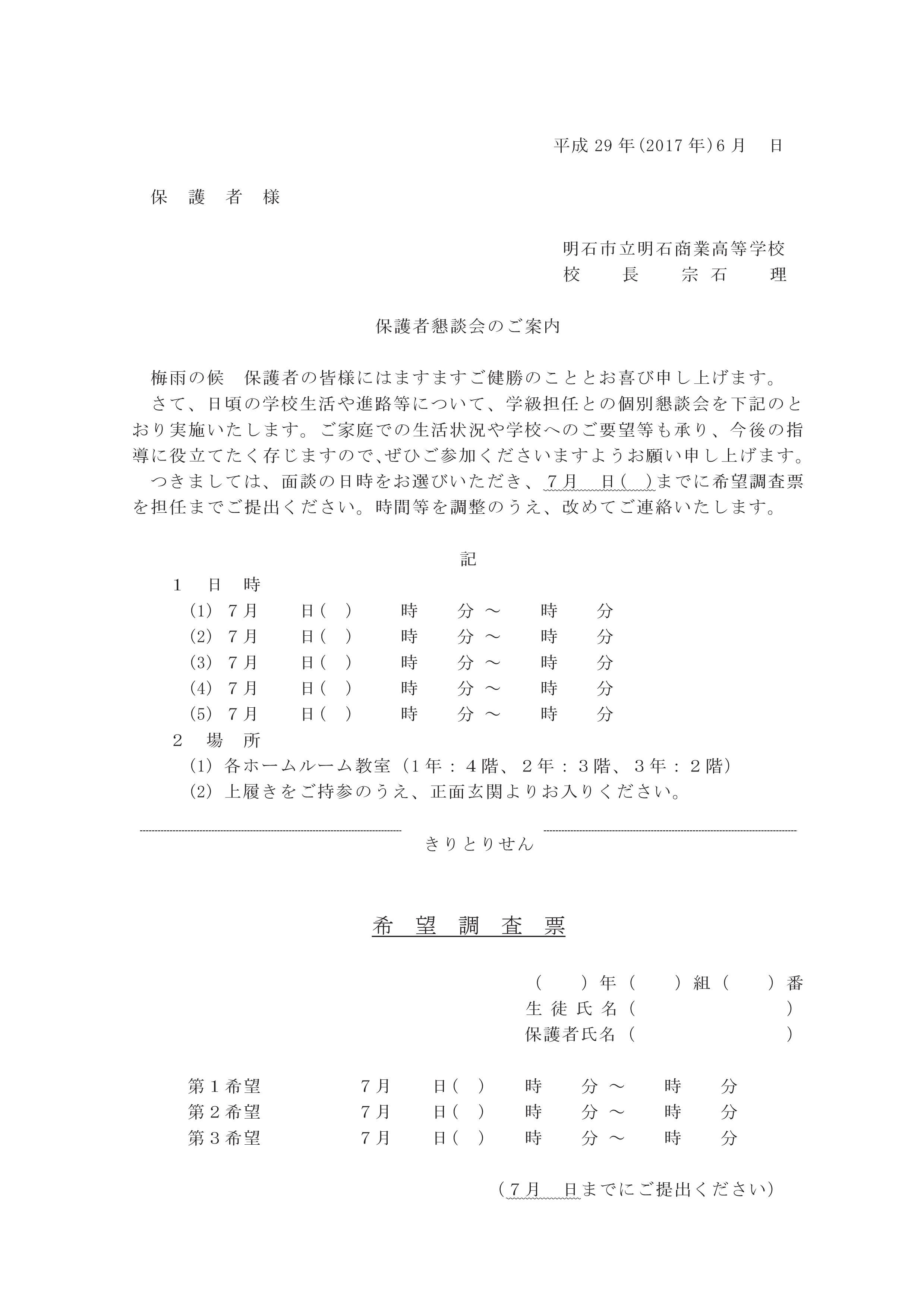 梅雨の候 保護者の皆様にはますますご健勝のこととお喜び申し上げます。 さて、日頃の学校生活や進路等について、学級担任との個別懇談会を下記のとおり実施いたします。ご家庭での生活状況や学校へのご要望等も承り、今後の指導に役立てたく存じますので、ぜひご参加くださいますようお願い申し上げます。 つきましては、各担任の設定した面談の日時をお選びいただき、締切日までに希望調査票をご提出ください。時間等を調整のうえ、改めてご連絡いたします。