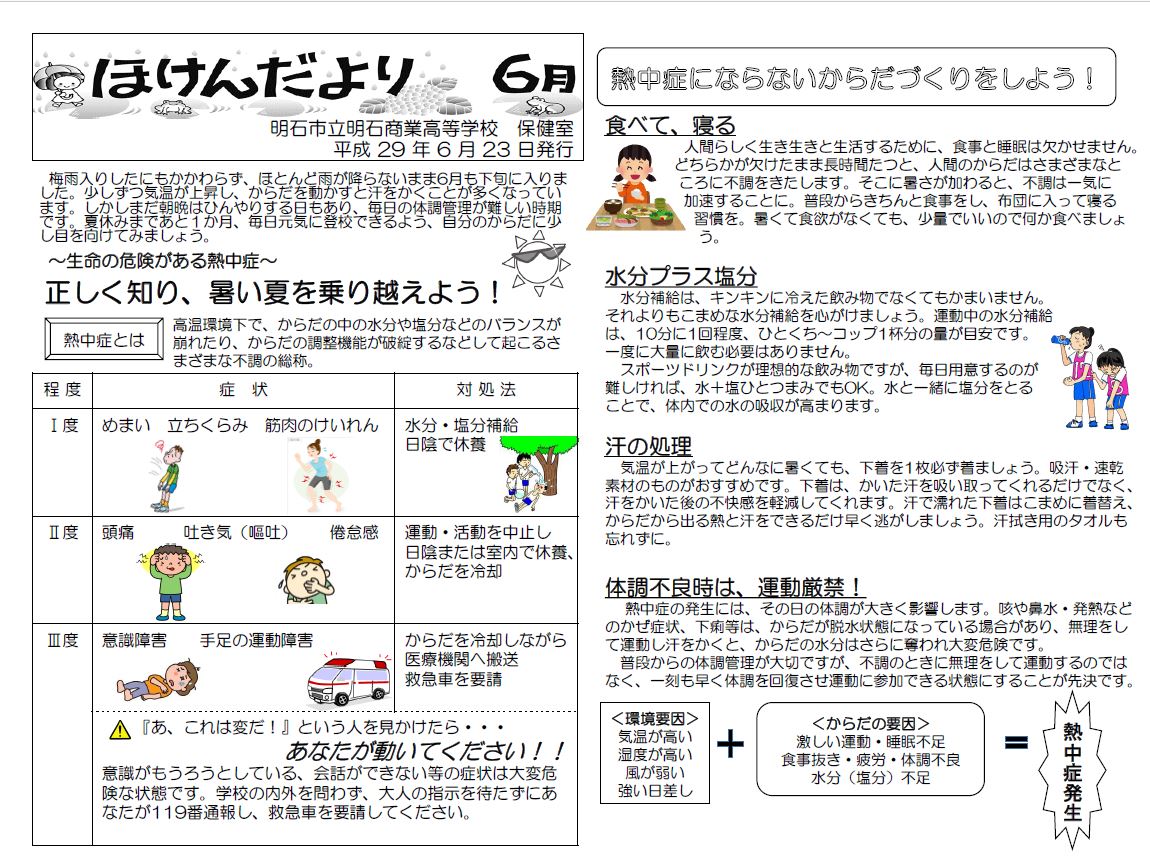 梅雨入りして少しずつ気温が上昇し、からだを動かすと汗をかくことが多くなってまいりましたが、まだ朝晩はひんやりする日もあり、毎日の体調管理が難しい時期です。今週末からようやく梅雨らしく雨が続くような天気予報になっています。 夏休みまであと1か月、毎日元気に登校できるよう、生徒自身のからだに少し目を向けさせ、熱中症に対して注意喚起するために配布いたしました。期末考査前でもあり、ご家庭でも 朝食を食べてから登校するなど、健康増進にご協力いただけますようお願いします。