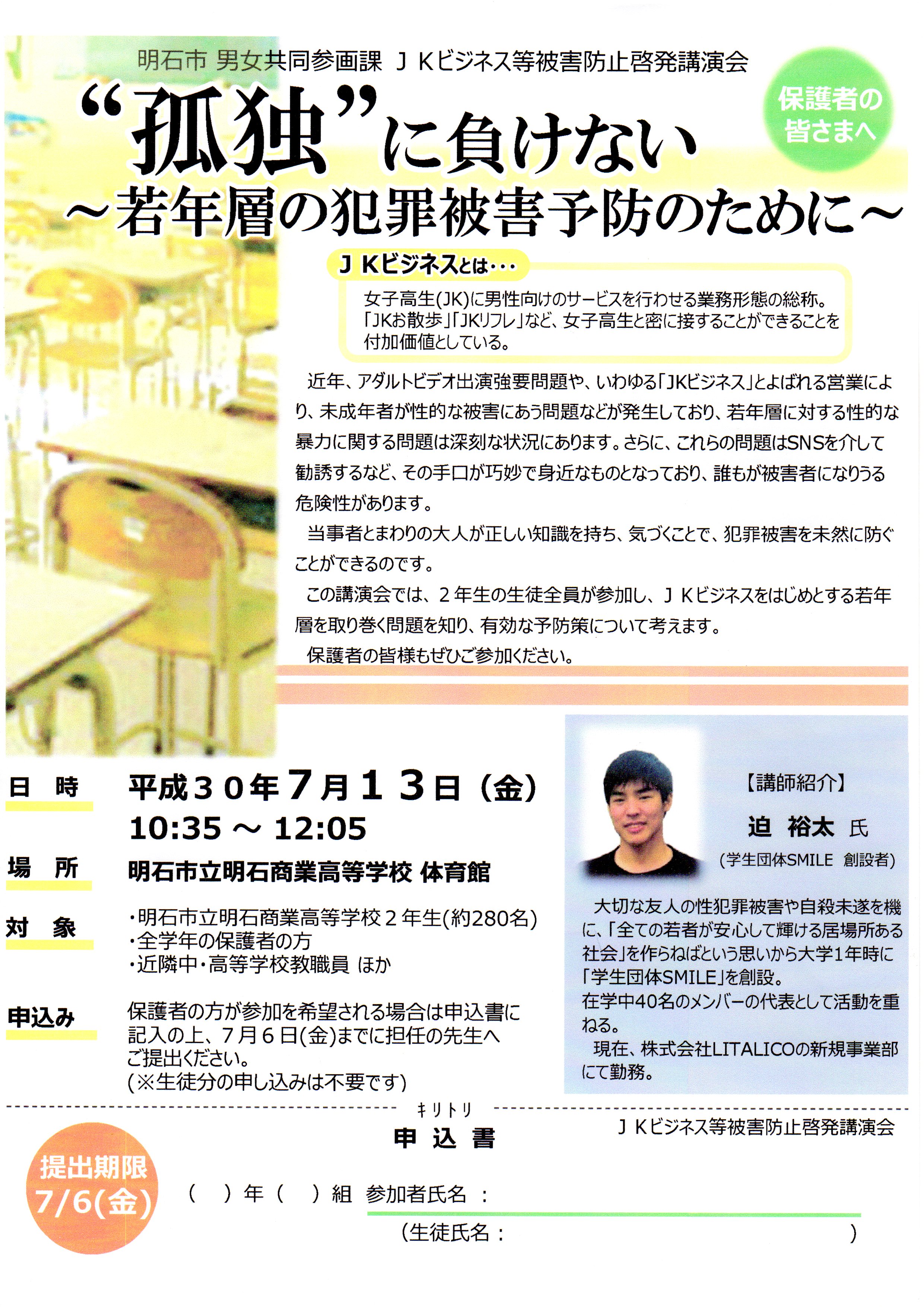 6/22(金)に学級担任より配布した案内のように、講演会が行われます。参加を希望される場合は、申込書に記入の上、7月6日(金)までに学級担任へご提出ください。