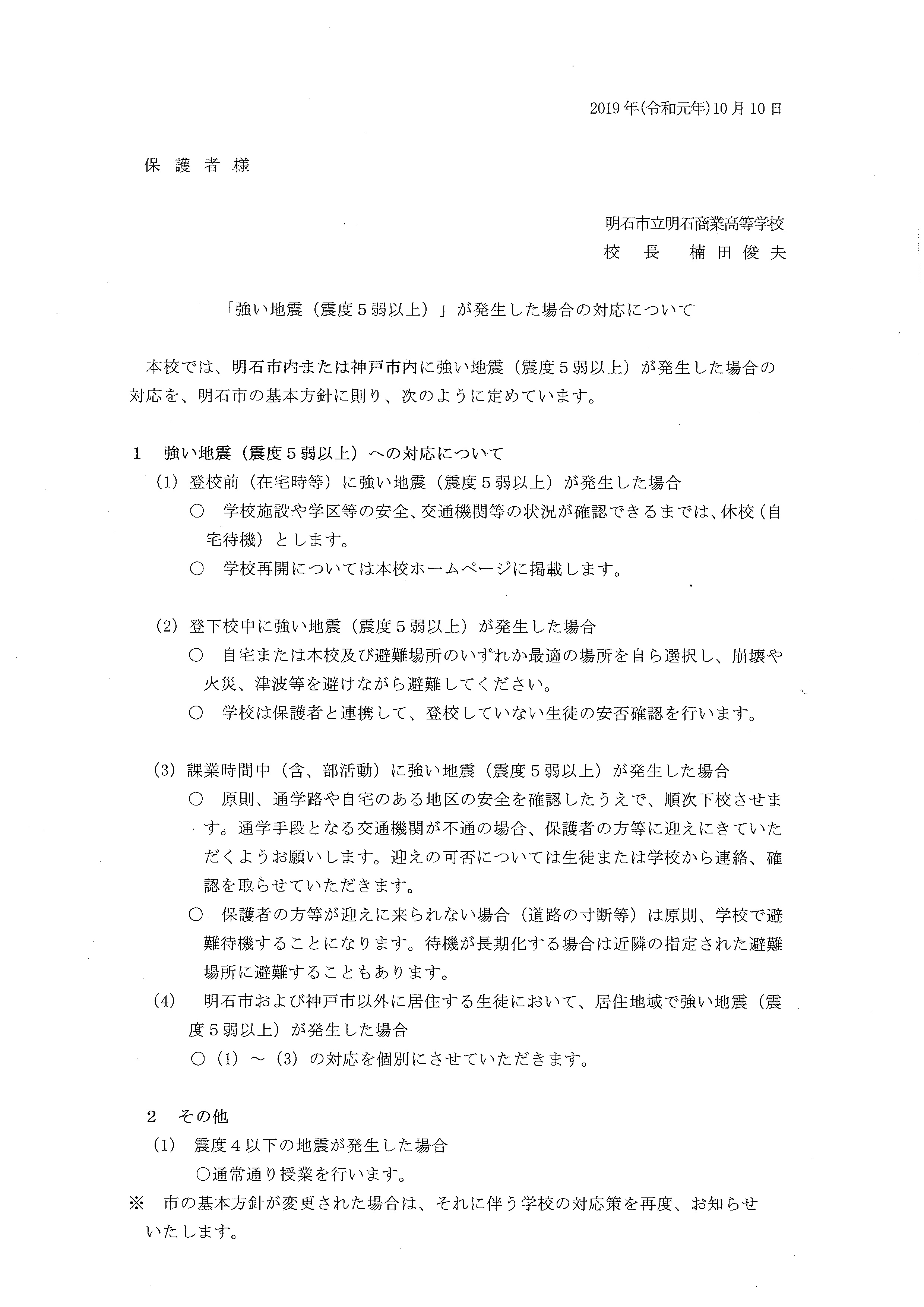 「強い地震(震度5弱以上)」が発生した場合の対応について