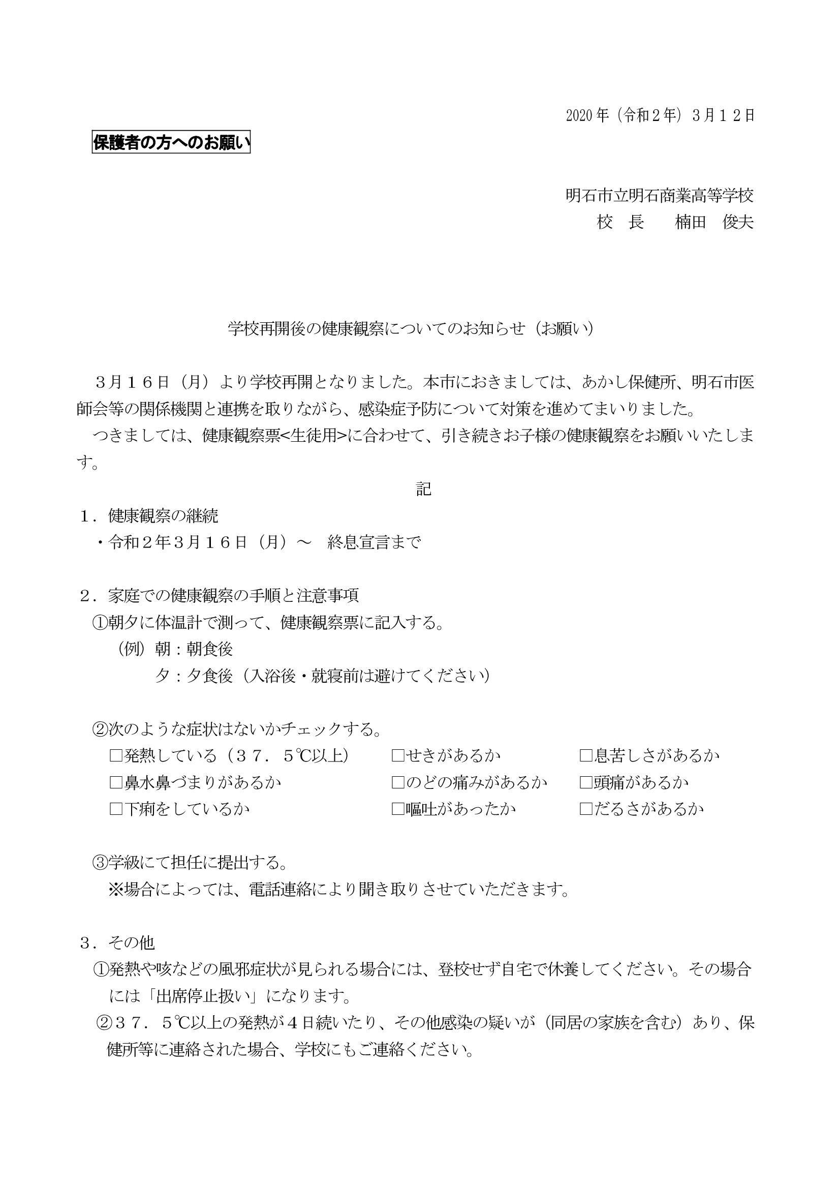 つきましては、健康観察票<生徒用>に合わせて、引き続きお子様の健康観察をお願いいたします。