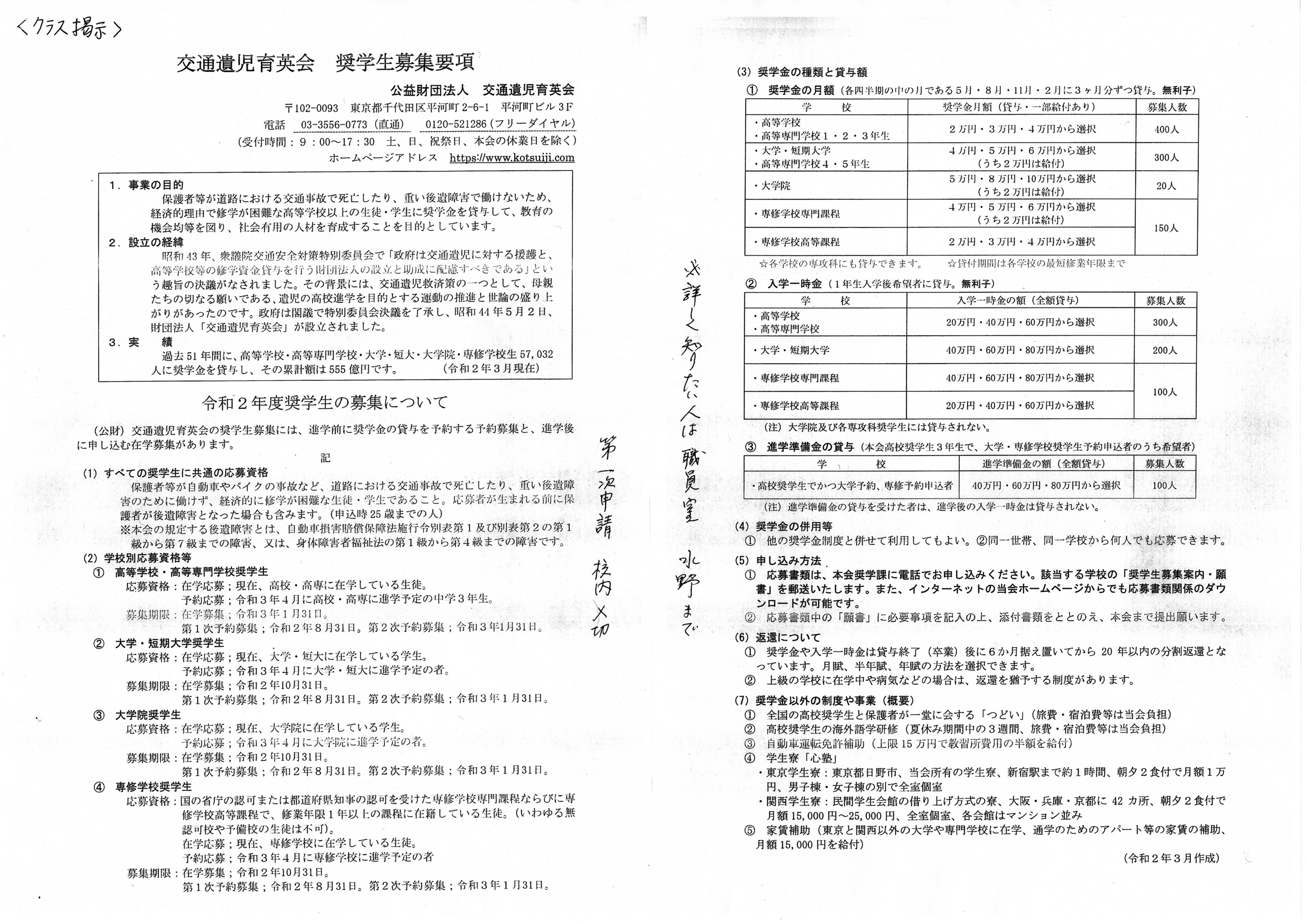 別紙のとおり、交通遺児育英会奨学生募集の案内がきました。詳細は、総務部水野まで問い合わせ願います。第一次申請の校内締め切りは7/22(水)です。