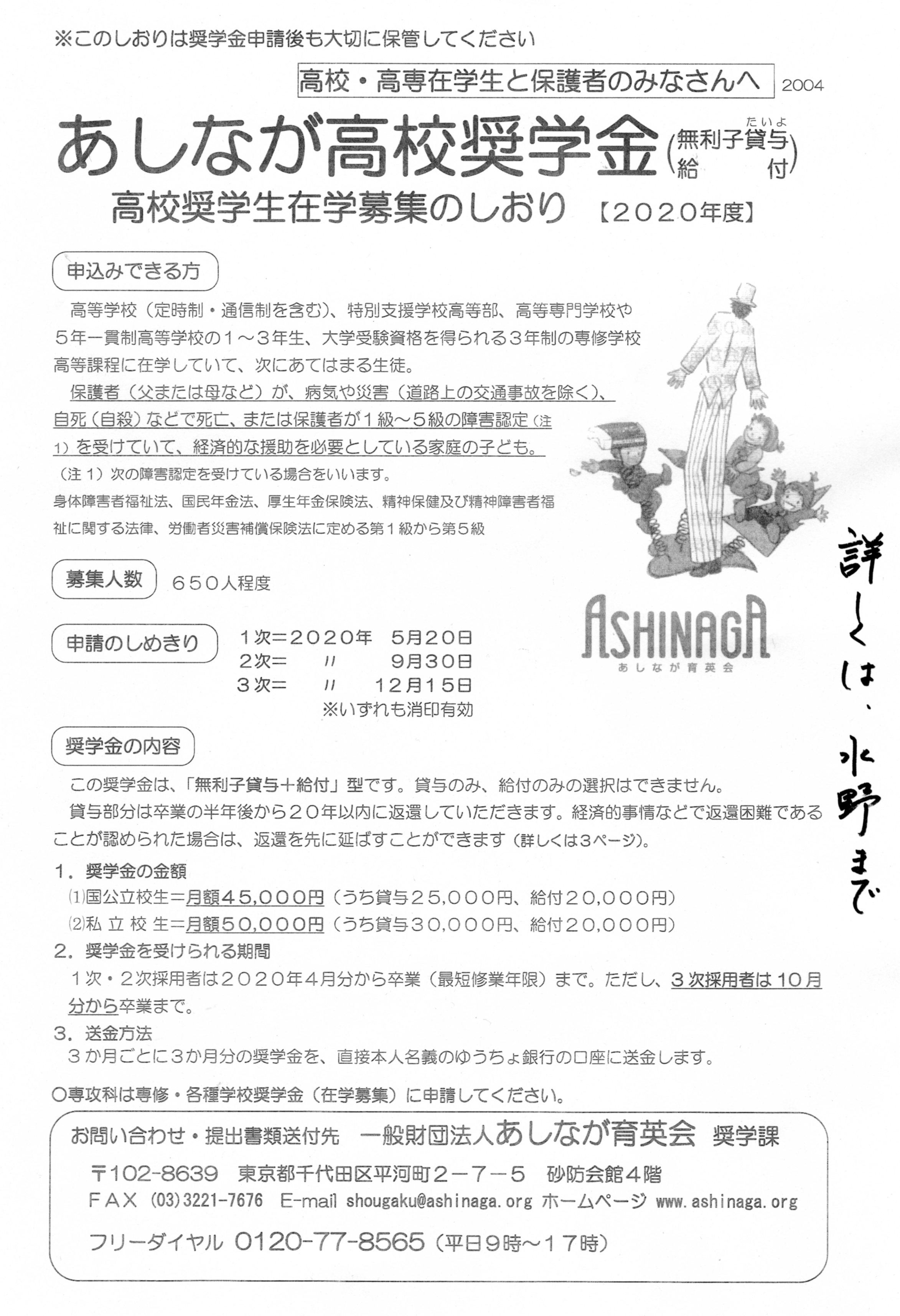 別紙のとおり、あしなが高校奨学金の奨学生募集の案内がきました。 詳細は、総務部水野まで問い合わせ願います。