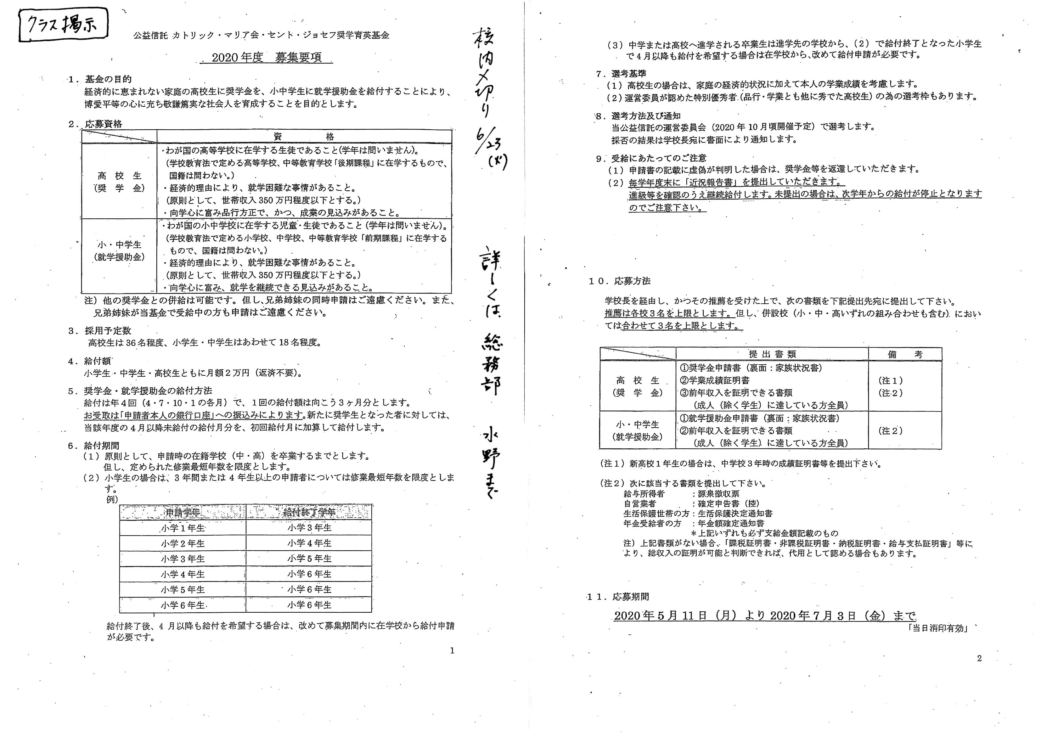 別紙のように、公益信託 カトリック・マリア会・セント・ジョゼフ奨学育英基金の案内がきました。詳細は、水野まで問い合わせ願います。6/23(火)締め切りです。