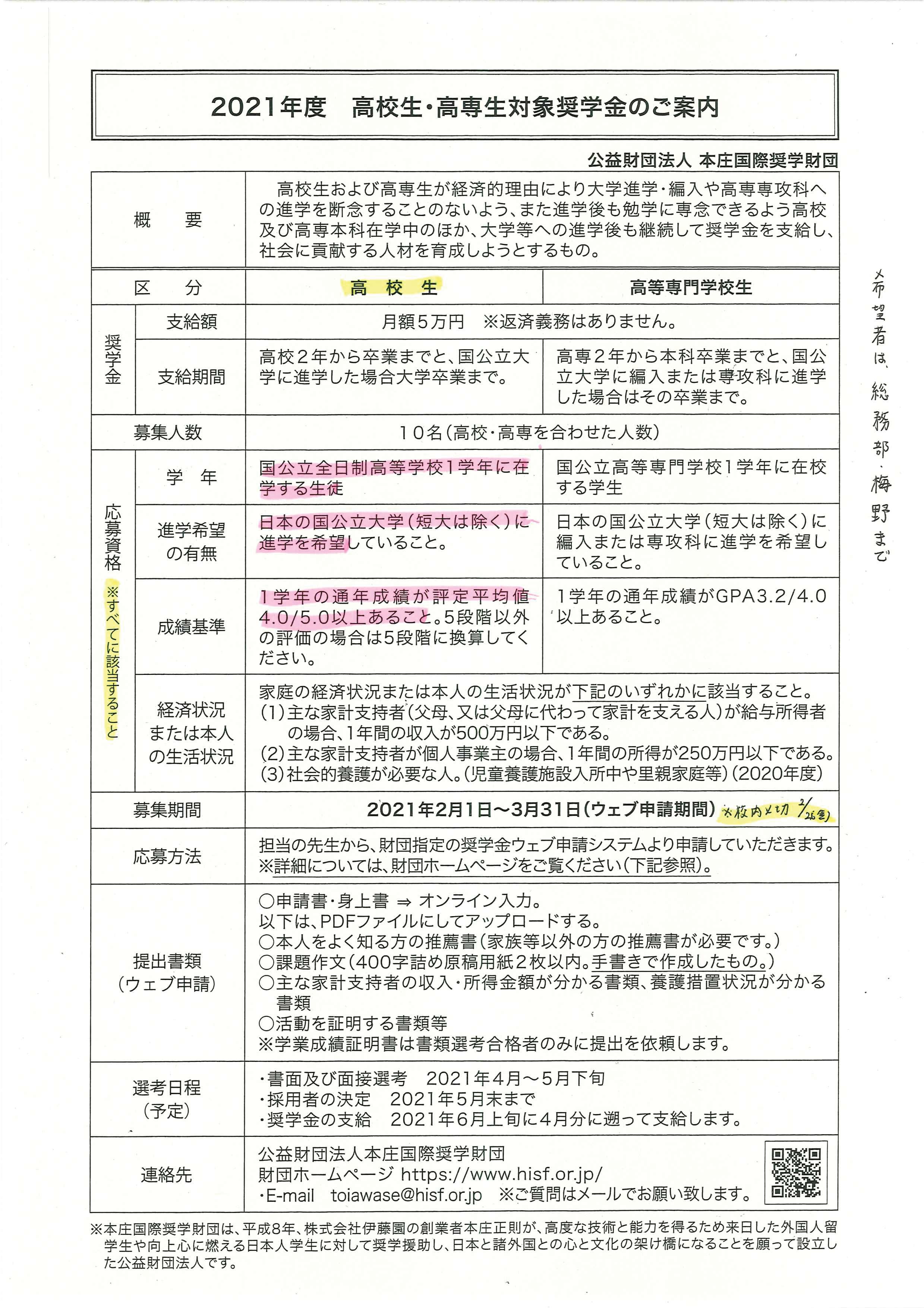 別紙のように、本庄国際奨学金の案内がきました。詳細は、総務部 梅野先生まで問い合わせ願います。