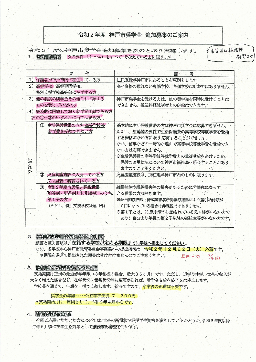 別紙のように、神戸市奨学金の追加募集の案内がきました。詳細は、総務部 梅野先生まで問い合わせ願います。