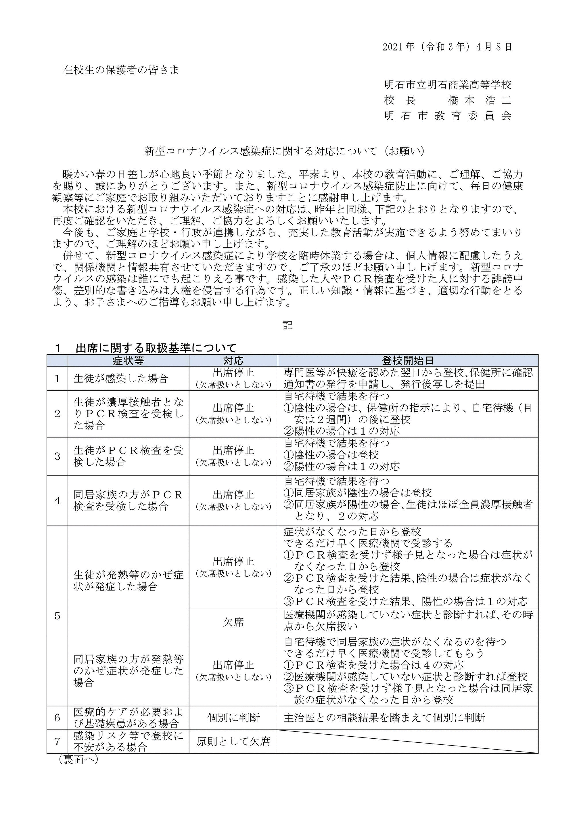 在校生の保護者の皆さま 新型コロナウイルス感染症に関する対応について(PDF:217KB)