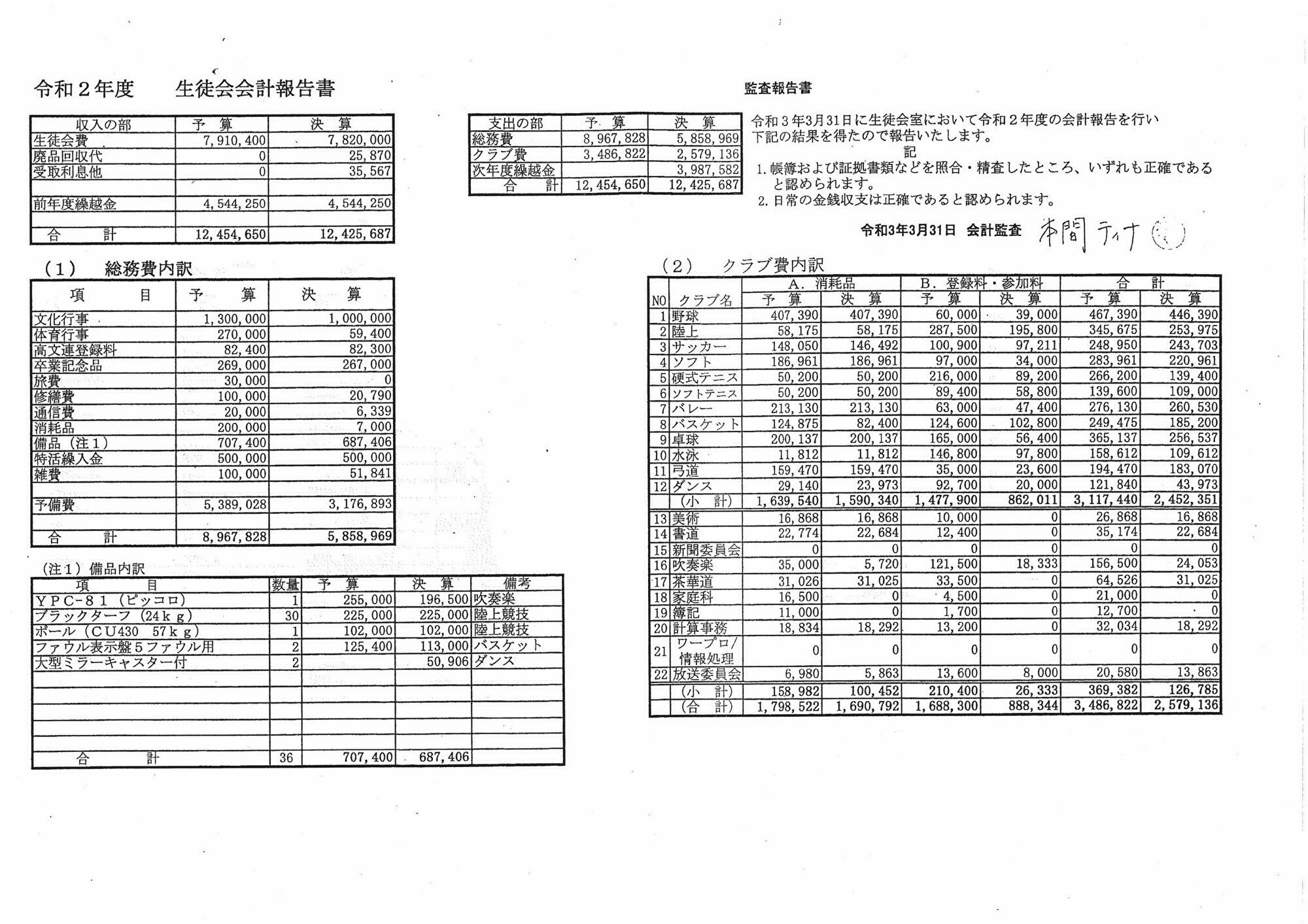 なお、配布された「令和2年度生徒会会計報告書・令和3年度生徒会会計予算書」は保護者に渡すように連絡しました。