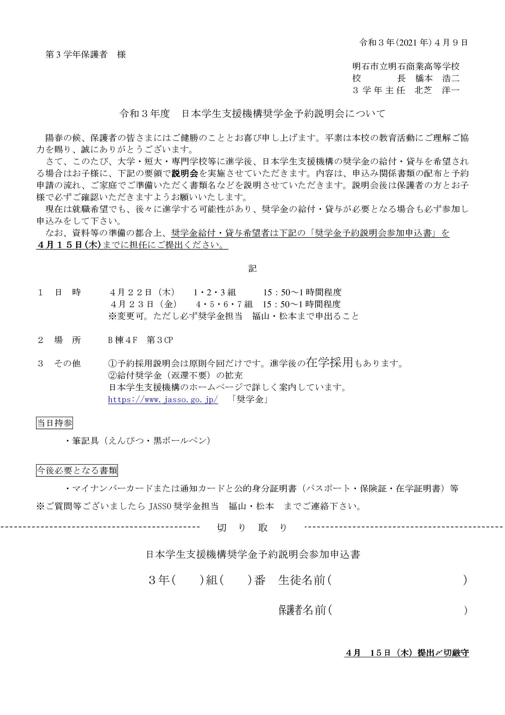 令和3年度 日本学生支援機構奨学金予約説明会について
