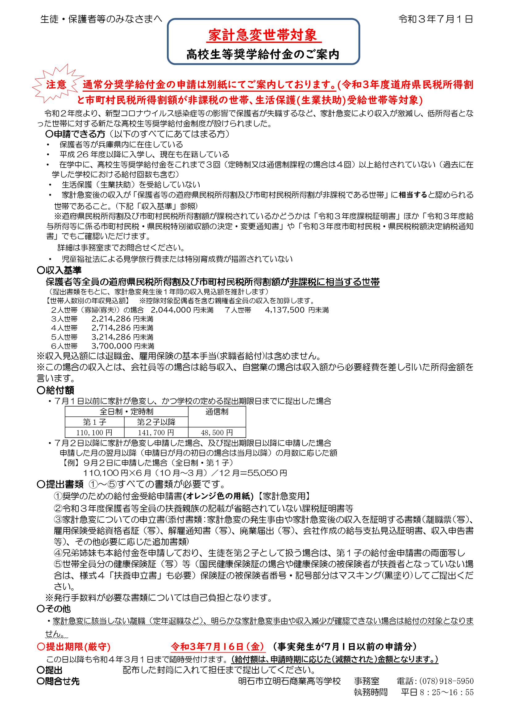 「家計急変世帯対象高校生等奨学給付金」のご案内