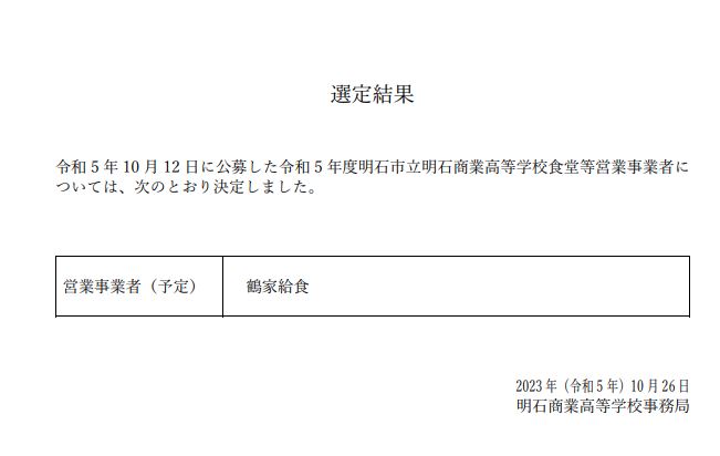 明石市立明石商業高等学校における生徒・職員の福利厚生のための食堂等営業事業者(以下、事業者) について選定結果を掲載します。ご確認ください。