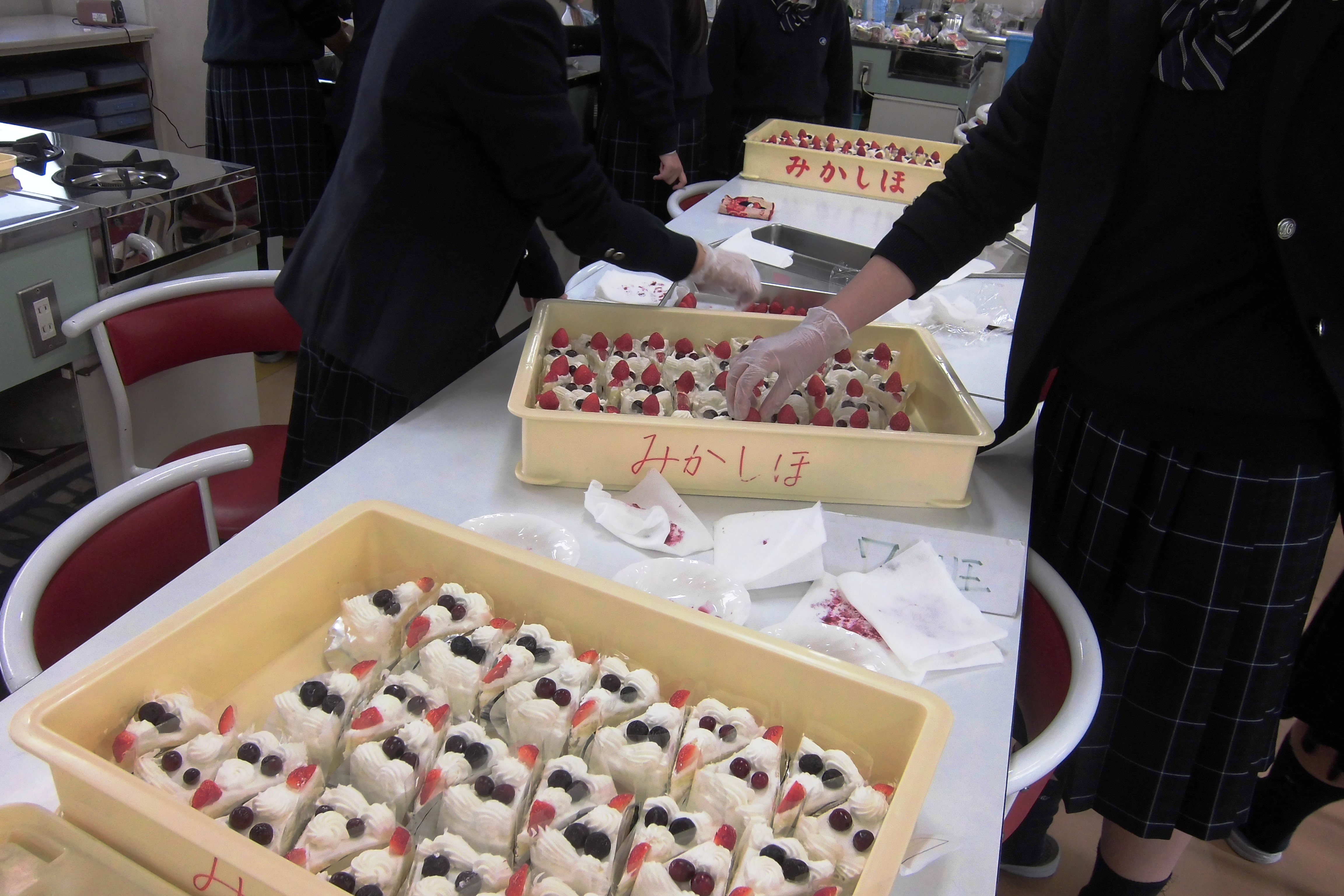 文化部発表会のあと、地域の障がいのある方たちのための昼間支援施設「サポートセンター 翔(はばたき)」のクリスマス会用にケーキを100個作りました。家庭科部は専門学校の学生さんに教えていただきながら、オリジナルのデザインを考えて、デコレーションしました。 家庭科部ではボランティア体験入部も受け付けています。特に3年生のみなさん、卒業までの期間を充実させてみませんか?1年生・2年生のみなさん、楽しくボランティアを始めてみませんか?お菓子作りが大好きなら、ぜひ一緒にやってみましょう!!