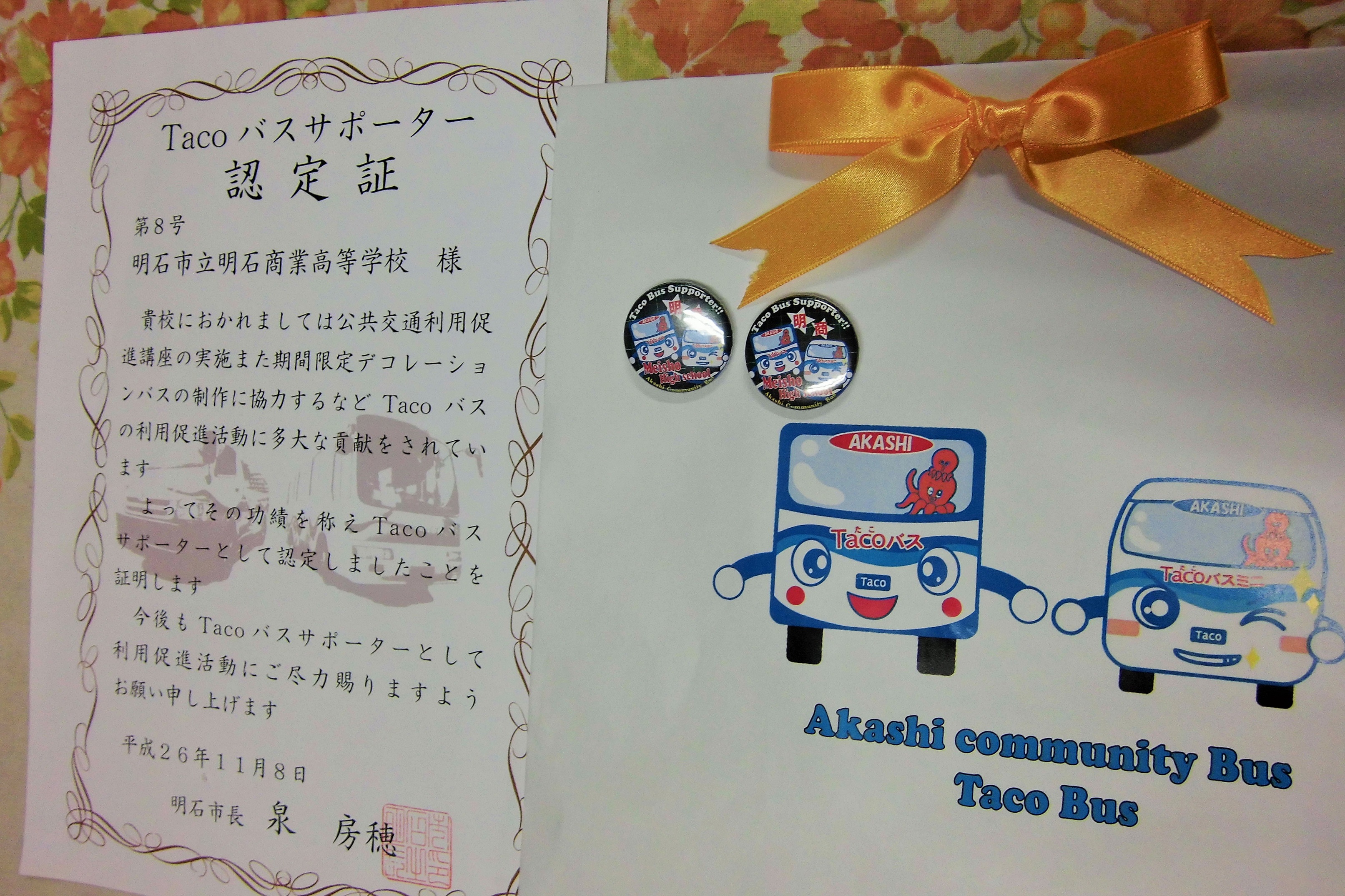 11月21日(金)の芸術鑑賞会の後、たこバスサポーター認証式があり、明石市土木交通部部長様から認証をいただきました。たこバス10周年記念行事として、本校生徒によるラッピングバスが青葉台ルートなどで12月25日まで運行しています。明石市民のたこバスを応援するとともに、乗車マナー向上に努めましょう。