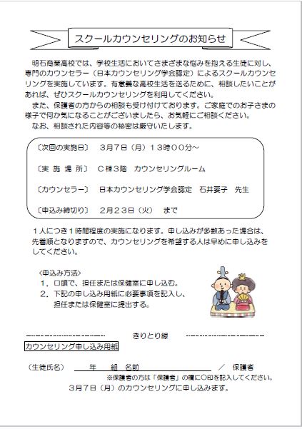 本校では、生徒・保護者・教職員等を対象に、専門のカウンセラーによるスクールカウンセリングを実施しています。人間関係についてやいじめ、不登校、発達障害等、心配なことや不安に思っていることがあればいつでも相談してください。相談内容等の秘密は守られます。相談時間は1人あたり1時間程度で、3名まで実施可能です。実施時間、希望者が多数いる場合は先着順となります。カウンセリングを希望する場合は、学校で配布している申し込み用紙を担任または保健室に提出するか、直接担任または保健室に連絡をしてください。 〔実施日時〕 平成28年3月7日(月)13:00~ 〔実施場所〕 C棟3階 カウンセリングルーム(食堂、図書館がある棟です) 〔申し込み締切り〕 平成28年2月23日(火) 〔カウンセラー〕 日本カウンセリング学会 認定カウンセラー 石井 要子 先生