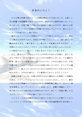 平成27年7月17日(金)は、台風11号の影響で臨時休校となりました。 予定していた1学期終業式が実施できませんでしたので、校長から生徒の皆さんへのメッセージを掲載します。 下記リンクからご覧下さい。