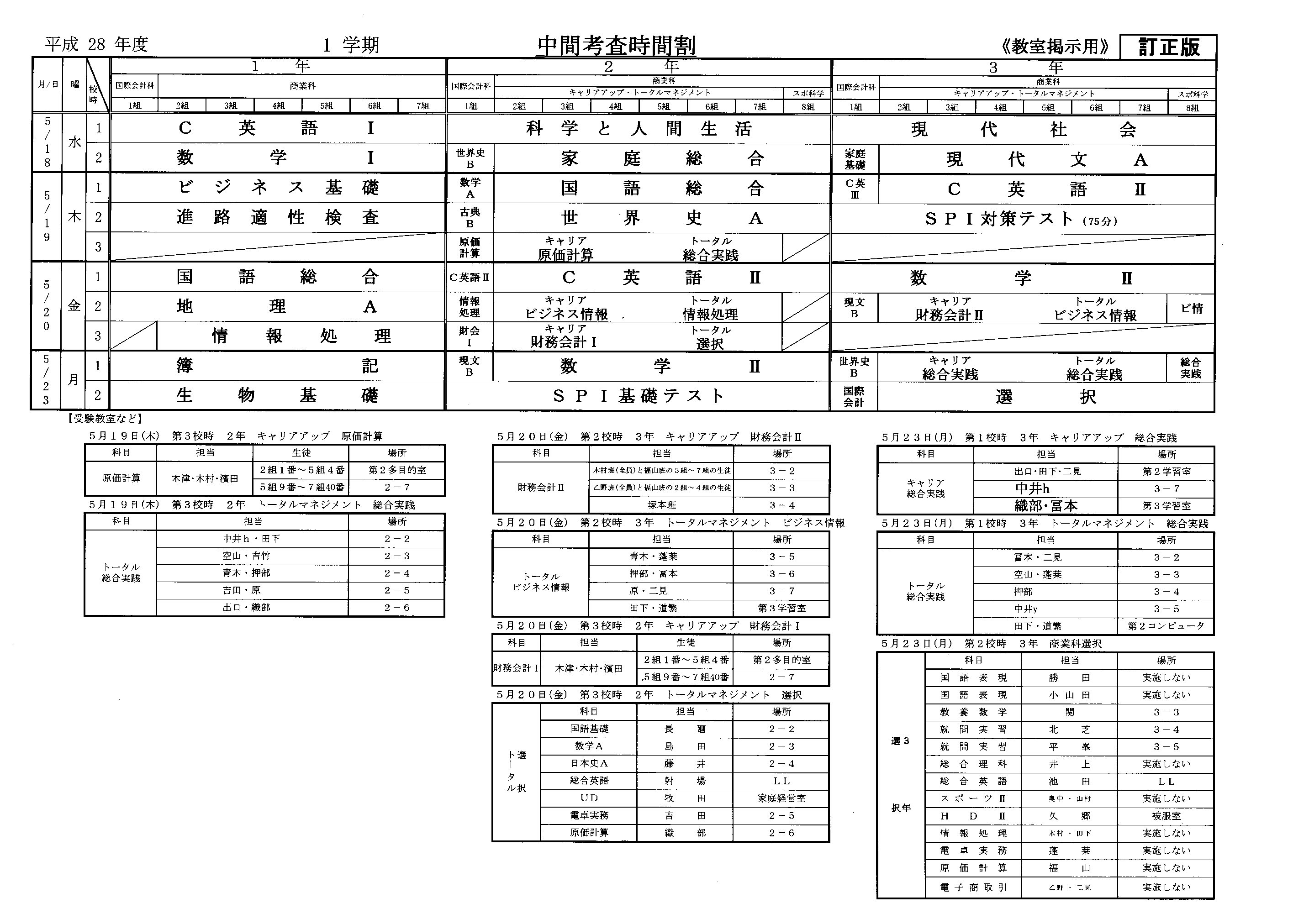 平成28年度1学期中間考査時間割
