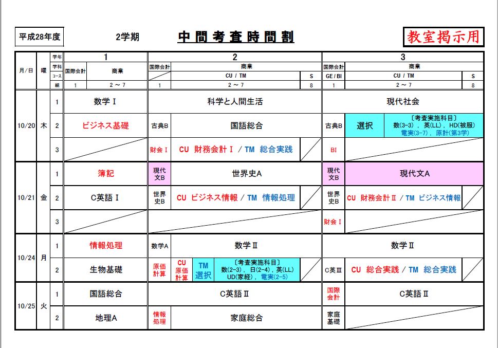 2学期中間考査時間割